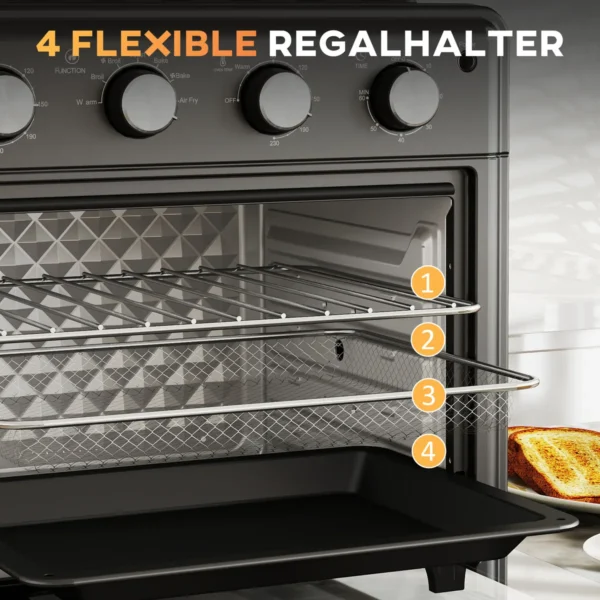 Jei vertinate patogumą kasdieniame gyvenime, HOMCOM mini orkaitė puikiai tiks jums. Mini orkaitėje yra reguliuojama temperatūra, laikmatis ir septyni skirtingi gaminimo režimai, kuriuos galima lanksčiai pritaikyti pagal Jūsų pageidavimus. 30 litrų talpos ir keturių vidaus lygių, įskaitant įvairius priedus, ši stalinė orkaitė idealiai tinka šeimoms.