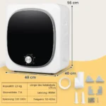 Mini skalbimo mašina 48x40x56 cm baltos ir juodos spalvos yra kompaktiškas sprendimas skalbiniams džiovinti mažose erdvėse, tokiuose kaip butai, bendrabučiai ar kemperiai (RV). Ši elektrinė džiovyklė su 800 W galia ir nerūdijančio plieno būgnu užtikrina efektyvų džiovinimą bei apsaugą nuo raukšlių.