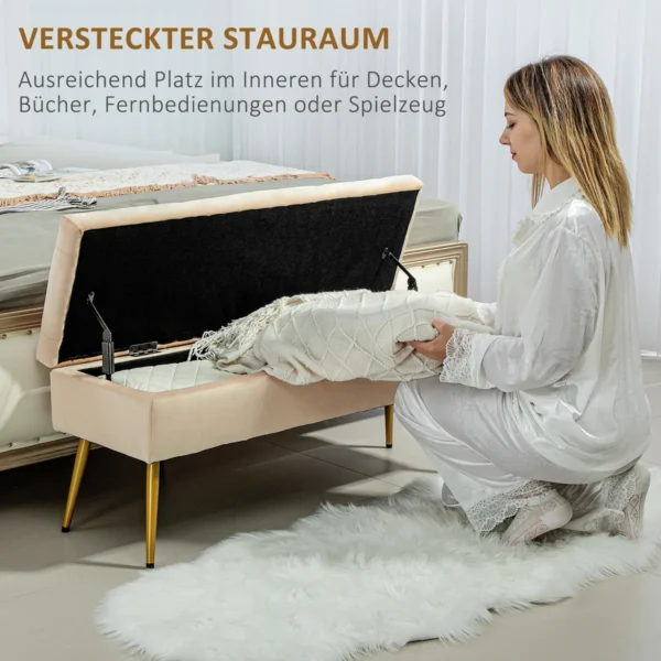 Patirkite HOMCOM stendo eleganciją su saugykla, puikiu stiliaus ir funkcionalumo deriniu. Su aksomu primenančiu paminkštinimu ir minkštu dangčiu, ši kėdutė suteikia patogią sėdėjimo vietą ir paslėptą saugojimo vietą. Tvirtos metalinės taburetės kojelės taip pat užtikrina prašmatnų, kokybišką įspūdį bet kurioje patalpoje.
