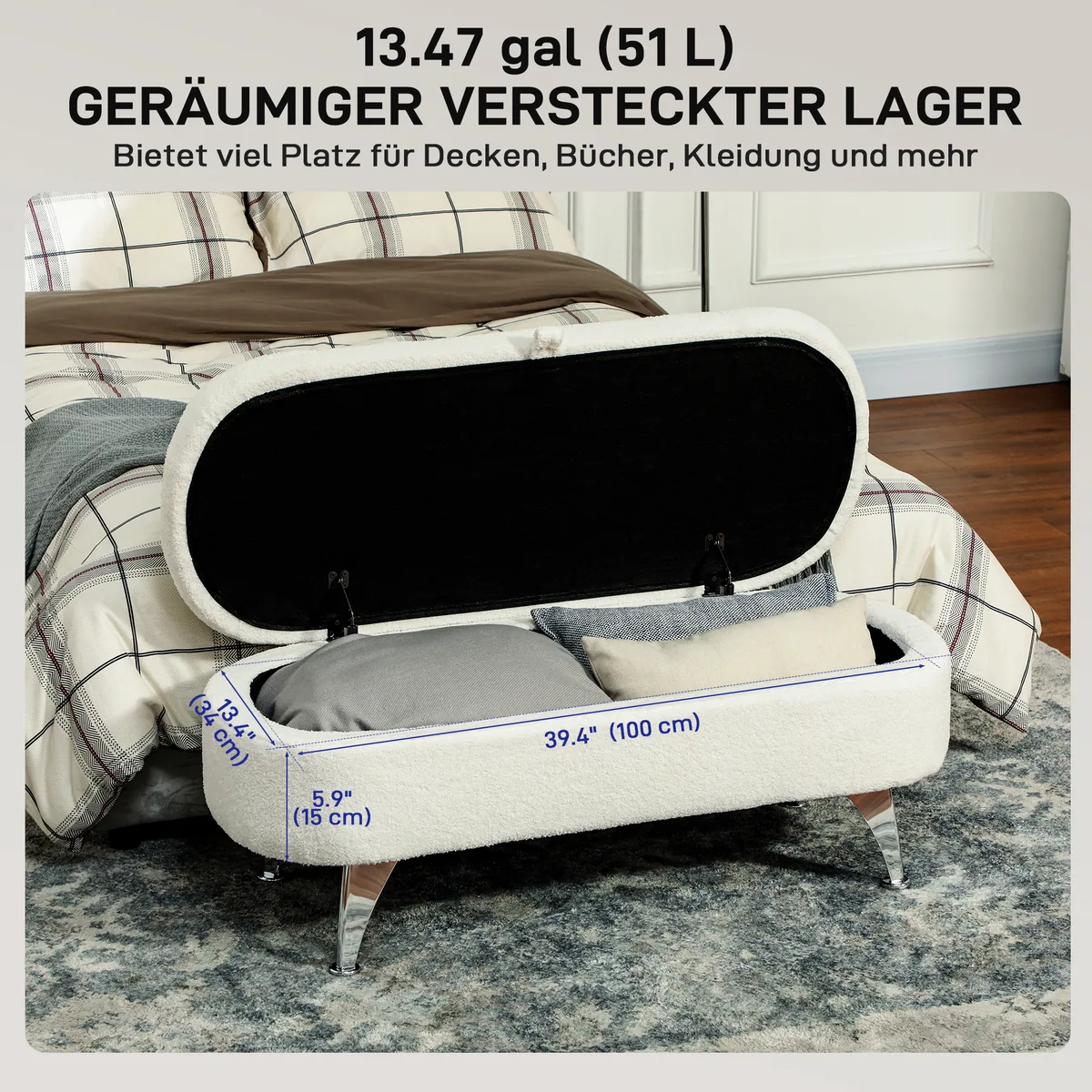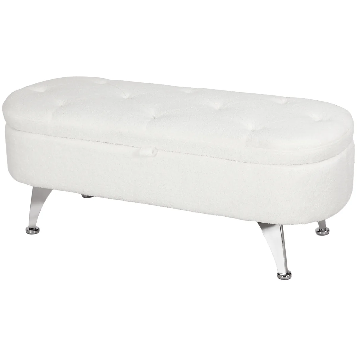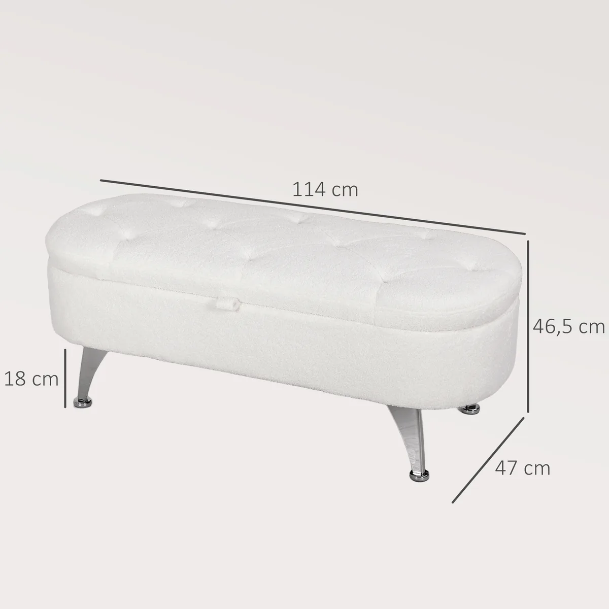Patirkite HOMCOM stendo žavesį su saugykla. Antklodes, pagalves ir kitus daiktus galima nepermatomai ir saugiai laikyti po atverčiamu dangteliu. Minkštas medžiaginis užvalkalas ir deimantinio rašto kuokštuotas suoliuko paviršius suteikia patogią sėdynę. Šis ovalus perlas su metalinėmis kojomis puikiai tinka kaip koridoriuje ar lovos suoliukas, taip pat kaip kėdutė su metalinėmis kojomis bet kokiam kambariui suteikia jaukumo ir universalumo.