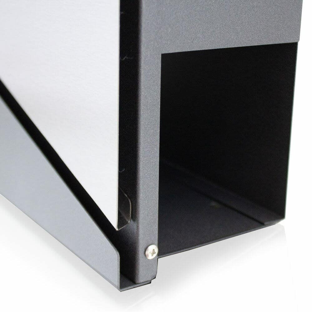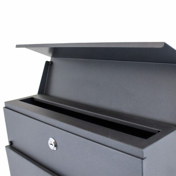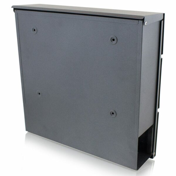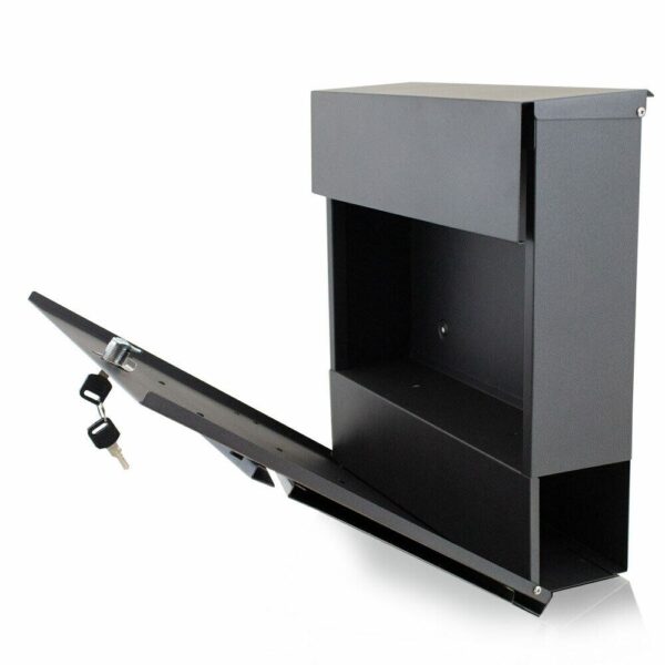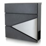 MODERNI PAŠTO DĖŽUTĖ DIDELIS MADINGAS DIZAINAS ; ;Šiuolaikinė pašto dėžutė turi įdomų madingą dizainą, kuris tikrai patraukia dėmesį.; Jis turi didelę talpą, kurio dėka puikiai tiks tiek namuose, tiek įmonėje. Jis rakinamas raktu. Dėžutės apačioje yra skyrius laikraščiams ir reklaminiams lankstinukams. Dėžutės tikrintuvas, uždengtas atvartu, neleidžia korespondencijai sušlapti. ; Techniniai duomenys: Matmenys: 370 x 370 x 105 mm, Žurnalo matmenys: 360 x 90 x 80 mm, Monetų priėmimo matmenys: 335 x 35 mm, Spalva: Grafitas ir nerūdijantis plienas, Medžiaga: Cinkuotas milteliniu būdu dažytas plienas / nerūdijantis plienas, Medžiagos storis skersmuo: 0,6-0,8 mm. Skylės matmenys: Horizontaliai 23,0 cm, Vertikaliai 17,0 cm, Įstrižai 28,5 cm. ; Komplekte: Pašto dėžutė su laikraščių laikikliu, 2x raktai, Montavimo komplektas.
