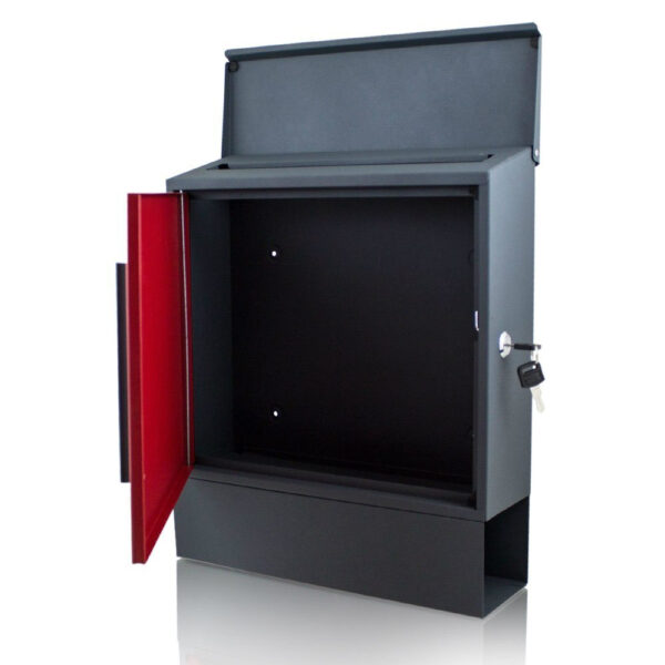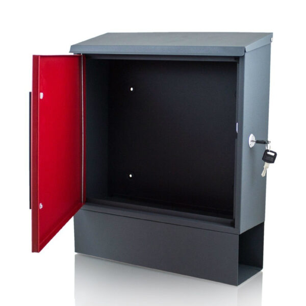 Moderni ir originali pašto dėžutė Originali ir moderni pašto dėžutė. Visiškai pagamintas iš milteliniu būdu dengto plieno, itin atsparus oro sąlygoms, įrengta vieta laikraščiams ir reklaminiams lankstinukams. Dėl savo tvirtos konstrukcijos ir didelės talpos puikiai tinka tiek kaip dėžė privačiam naudojimui, tiek įmonėse. Tai užtikrina visišką korespondencijos saugumą. Į komplektą įeina tvirtinimo detalės ir du raktai. Tamsiai pilkos spalvos su raudonu pašto dėžutės priekiu, laikraščių laikikliu po priekine kamera, dažytas milteliniu būdu.; ; Techniniai duomenys: Matmenys: 345 x 420 x 125 mm ;Matmenys presavimo rankena: 105 x 90 mm Svoris: 2,45 kg Spalva: tamsiai pilka su šviesiai pilku priekiu Medžiaga: plienas, dažytas milteliniu būdu ;; SKULĖS: Horizontaliai: 23,0 cm Vertikaliai: 17,0 cm Įstrižai: 28,5 cm ĮSKAIČIUOTA: – 1x žurnalų dėžutė,; – 2x veržliaraktis, – tvirtinimo medžiaga