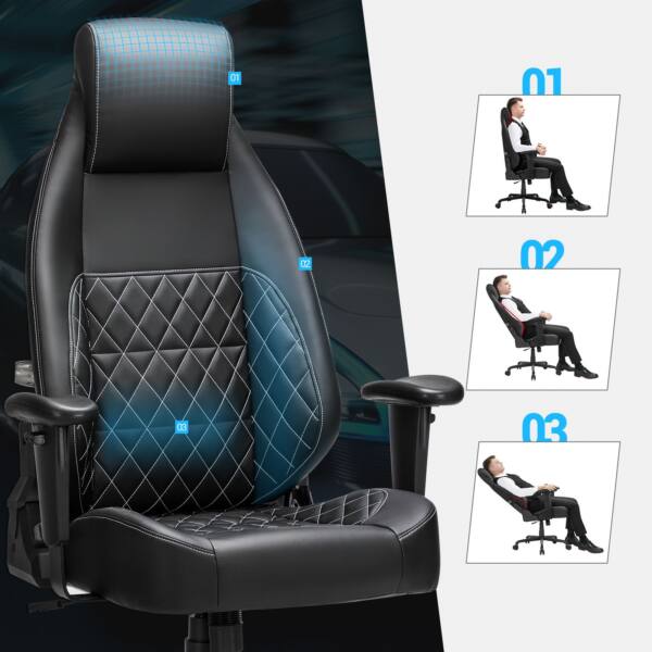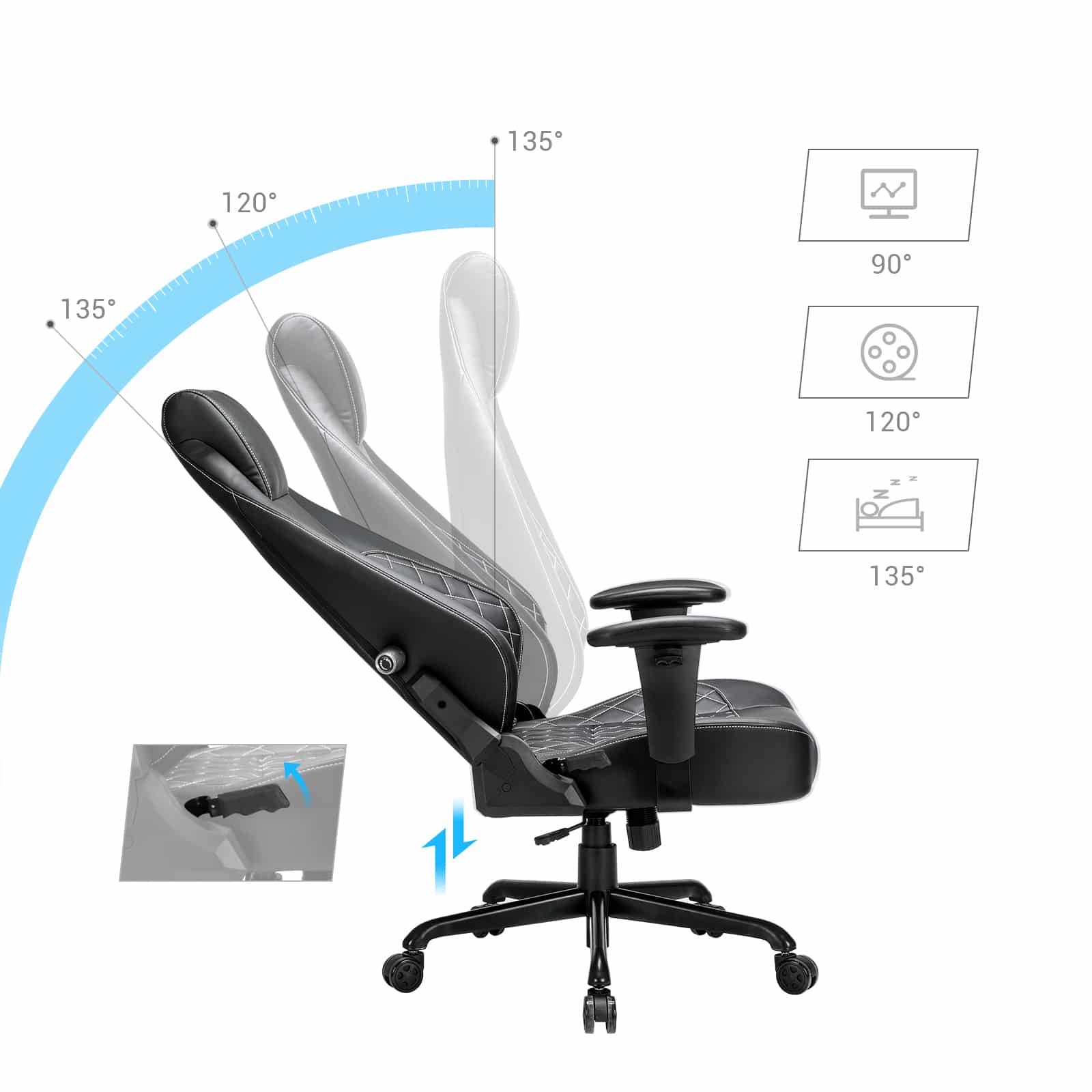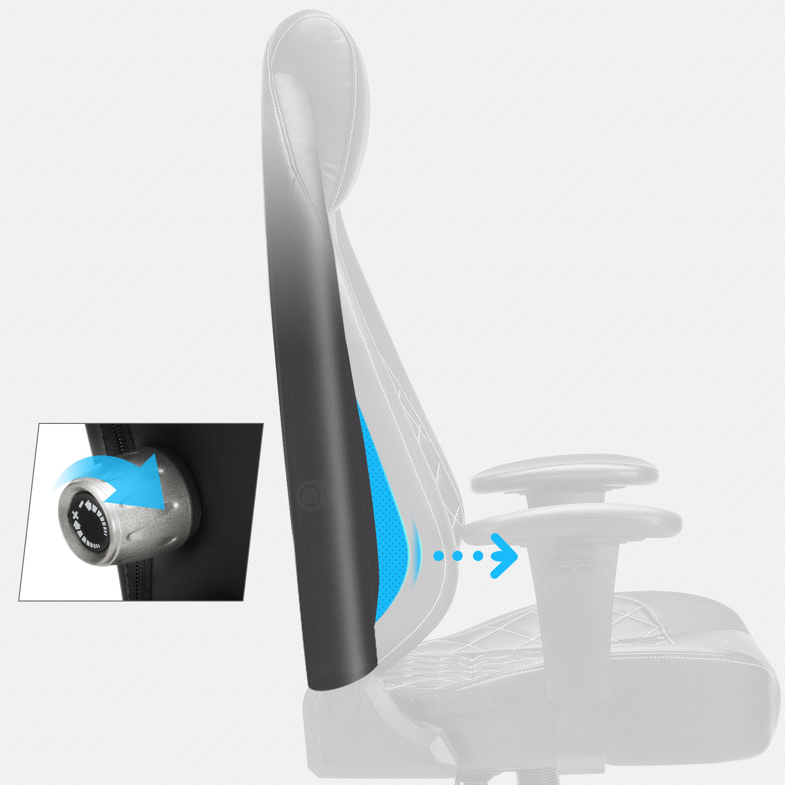 Kėdės atlošas gali būti reguliuojamas nuo 90° iki 135°, leidžiant jums rasti patogiausią sėdėjimo poziciją. Be to, kėdė turi paminkštintą galvos ir juosmens atramą, kuri padeda sumažinti nugaros ir kaklo įtampą.