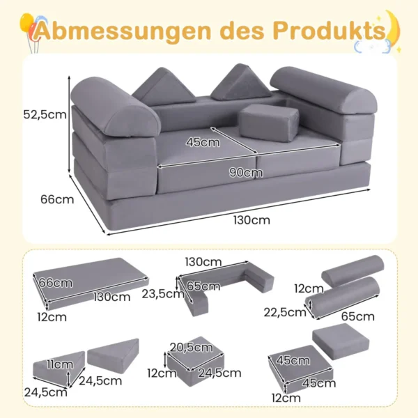 Modulinė vaikiška sofa 130x66x52,5 cm pilkos spalvos – universali žaidimų ir poilsio zona vaikams. Ši putplasčio sofa lengvai transformuojasi į miegamąją vietą, lėlių teatro sceną ar slėptuvę, skatinanti vaikų kūrybiškumą ir aktyvų laisvalaikį. Patogi ir saugi konstrukcija pritaikyta įvairioms vaikų veikloms nuo 3 metų amžiaus.