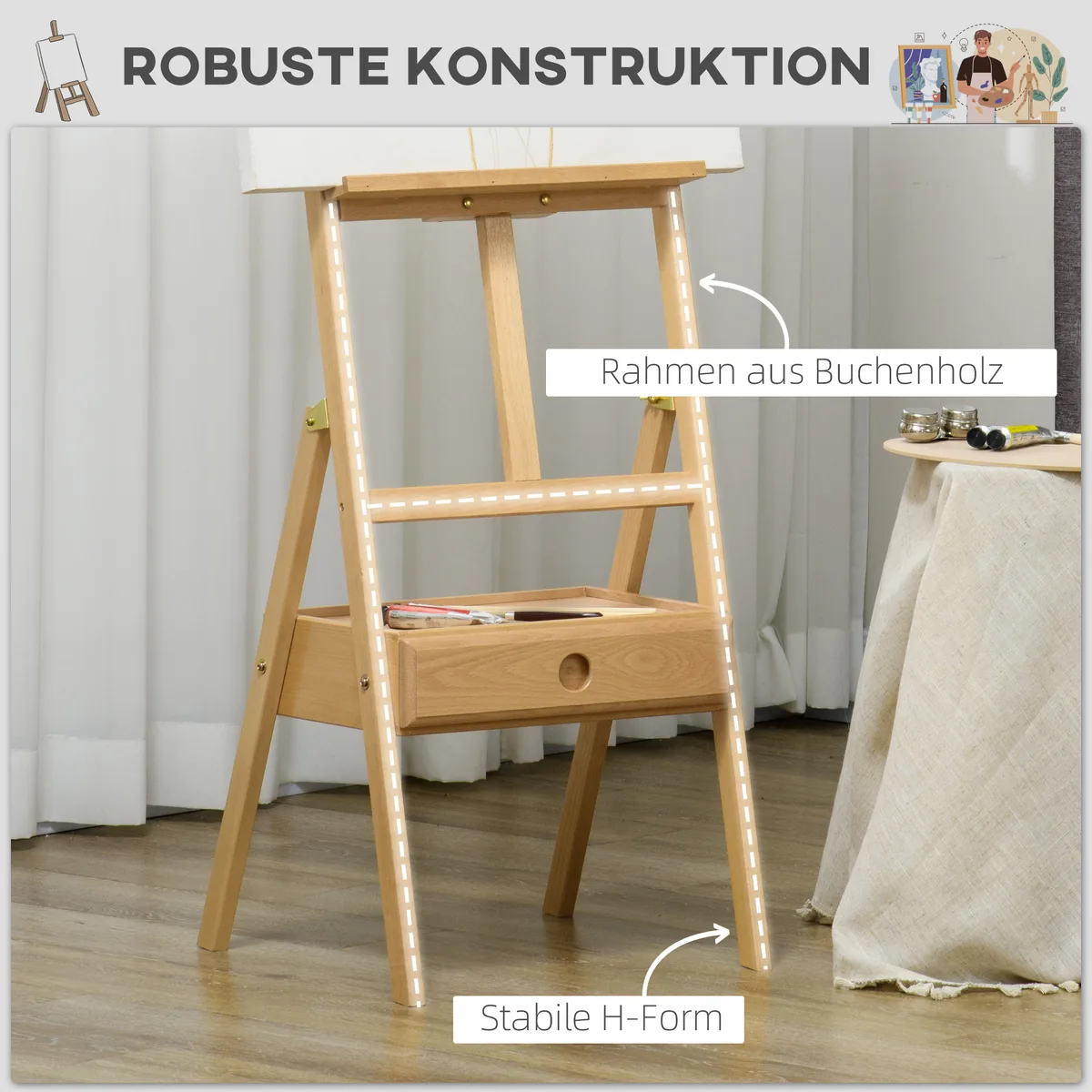 Patirkite didžiausią komfortą dažydami su Vinsetto molbertu. Šis molbertas, pagamintas iš buko medienos, siūlo jums profesionalią lentyną. Rėmas garantuoja tvirtą stabilumą. Be to, aukščio reguliavimo funkcija leidžia dažyti norima padėtyje – sėdint ar stovint, todėl geresnė laikysena ir mažesnis nuovargis. Naudodami šį molbertą savo meninę kelionę padarysite malonesnę ir efektyvesnę.