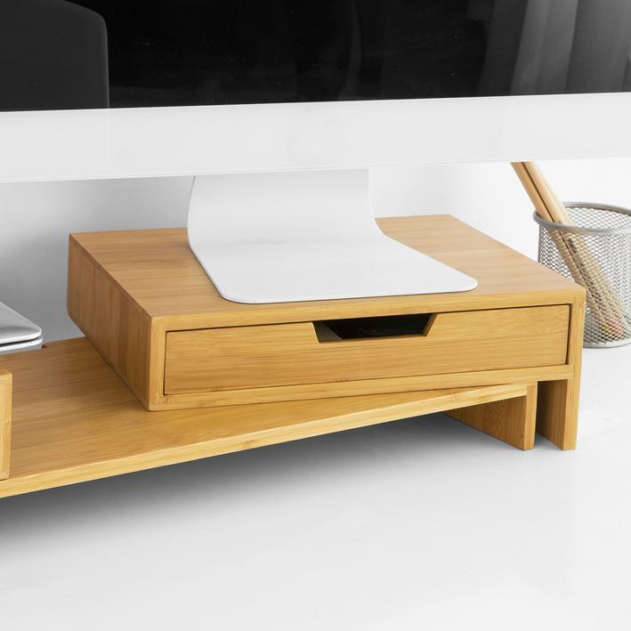 Monitoriaus stovas turi praktišką ištraukiamą stalčių su dviem skyriais, kuriame patogiai laikysite svarbiausius biuro reikmenis, tokius kaip rašikliai, užrašų lapeliai ar mobiliojo telefono įkrovikliai. Tai puikus sprendimas tiems, kurie nori turėti tvarkingą ir organizuotą darbo vietą.