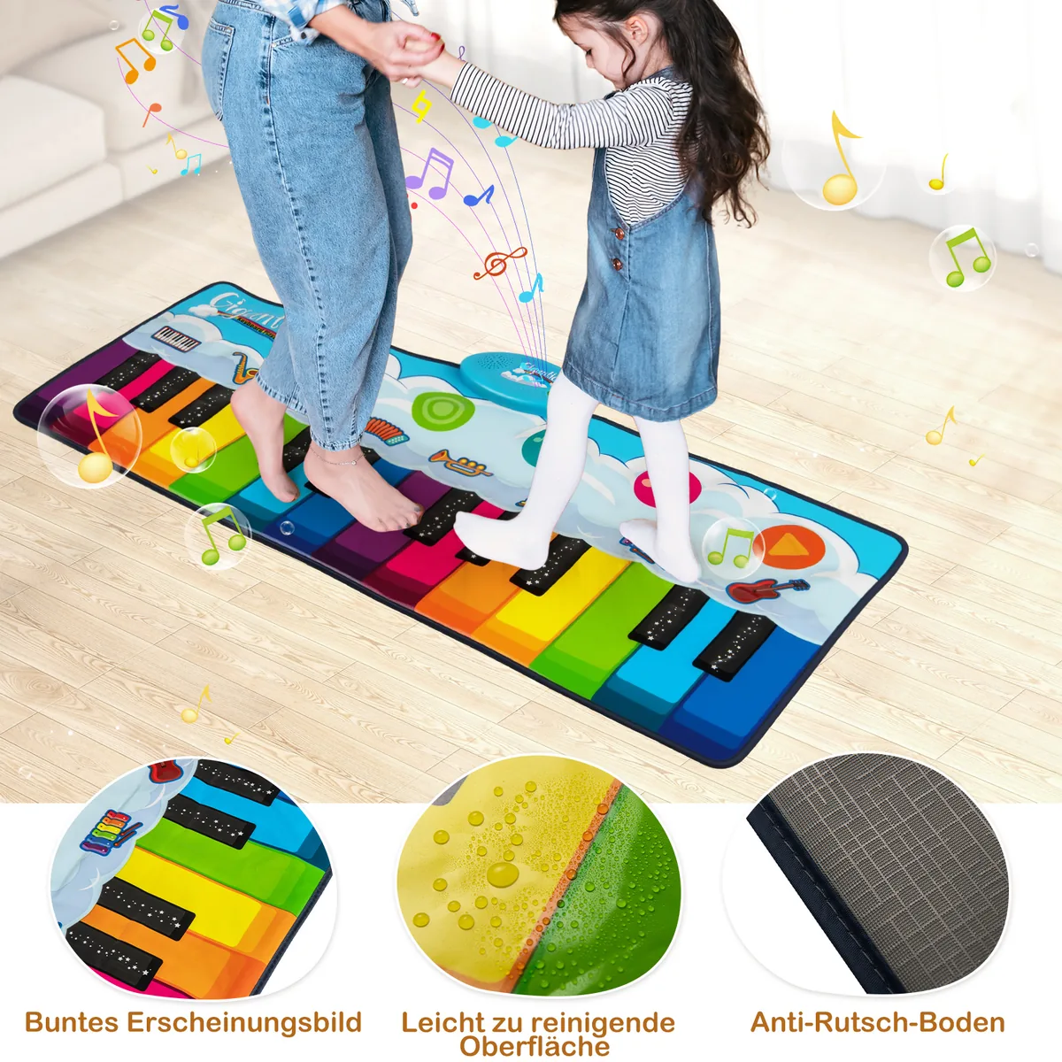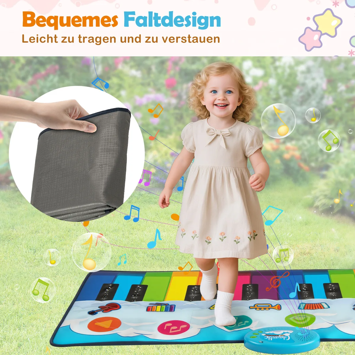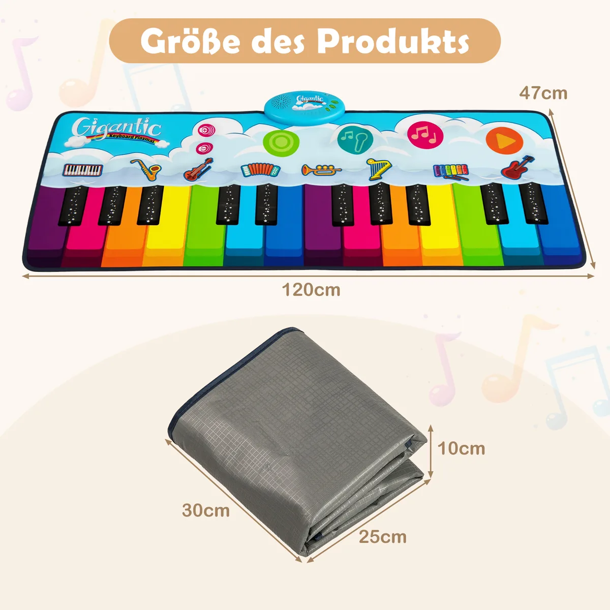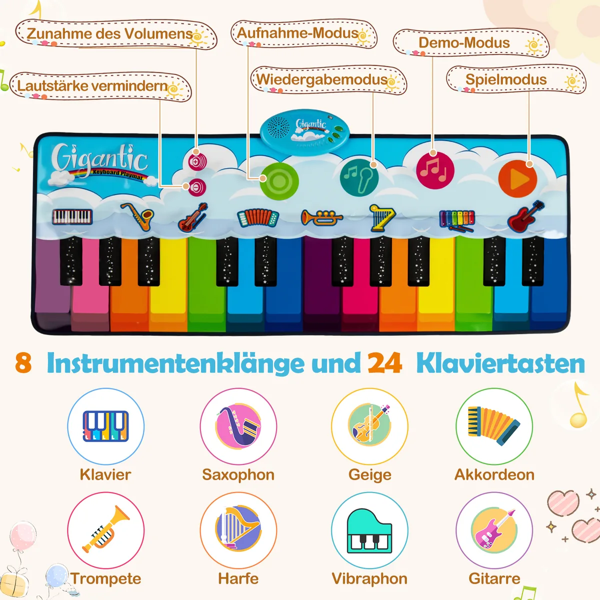 Muzikinis vaikiškas kilimėlis 120x47cm – puikus įrankis vaikams nuo 3 metų lavinti muzikinius įgūdžius ir kūrybiškumą. Šis fortepijoninis kilimėlis su 24 klavišais ir 8 instrumentų garsais leidžia pažinti įvairius muzikos tonus bei lavinti klausą bei koordinaciją.