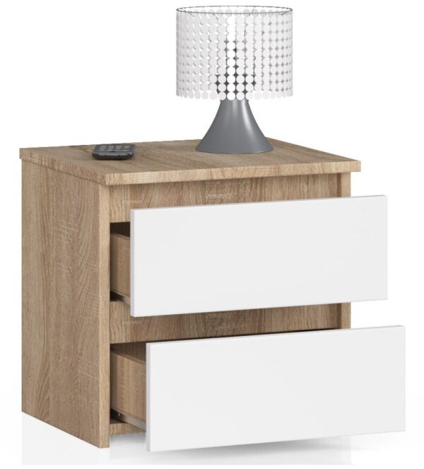 Ši kompaktiška ir stilinga komoda bus puikus pasirinkimas kaip naktinis staliukas ar papildoma daiktų laikymo vieta. Dviejuose stalčiuose tilps visi daiktai, kurių nenorime matyti, nuo dokumentų iki drabužių, o įdomios spalvos suteiks žavesio bet kokiam interjerui. Smėlio spalvos derinys asocijuotas su natūralia mediena, ąžuolo spalva su ryškia, gryna balta ypač tiks skandinaviško stiliaus kambariuose, taip pat suteiks jaukų charakterį minimalistiniam ir moderniam interjerui. Tokia patogi spintelė yra nuolat, kasdien naudojamas baldas – todėl ši komoda buvo pagaminta iš patikimo gamintojo atsparios pažeidimams laminuotos plokštės. Dėl to jis nebijo įbrėžimų ir įbrėžimų. Siekiant geriau apsaugoti nuo pažeidimų, komodos kraštai papildomai padengti ABS apvadu , kuri juos sustiprina ir apsaugo nuo atsitiktinių sužalojimų. Stalčiai su laminuotų plokščių fasadais juda metalinio volelio dėka kreiptuvai, užtikrinantys sklandų judėjimą, be kliūčių, norint išimti daiktus iš stalčių, visada buvo be vargo. Komoda skirta savarankiškai surinkti – jūs tai darote nereikia kviesti specialistų komandos, tereikia per trumpą laiką surinkti baldus namuose. Kad procesas būtų lengvas ir malonus, kartu su siunta pateikiama išsami instrukcija su išsamiu visų žingsnių aprašymu ir papildomais grafikais. Baldai suteikiama 24 mėnesių garantija.