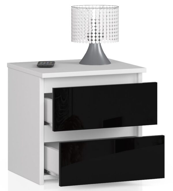 CL2 serijos naktinis staliukas yra su fasadais, pagamintais iš blizgios juodos plokštės, o konstrukcija pagaminta iš laminuotos MDF plokštės su akrilo danga. Spintelės matmenys yra 40x40x35 cm, o standartinėje versijoje yra du funkcionalūs stalčiai. Spintelės kraštas pagamintas iš ABS lukšto. Tai baldas, skirtas savarankiškai surinkti namuose. Pagrindiniai pranašumai, dėl kurių CL2 naktiniai staleliai yra labai universalus sprendimas miegamajame, yra šie: – elegantiška išvaizda baldai dėl naudojamų blizgių lakuotų fasadų, – didelis atsparumas dilimui ir pažeidimams dėl naudojamų kietų laminuotų plokščių, – stalčiai yra labai efektyvūs dėl naudojimo prie metalinių ritininių kreiptuvų naudojimo, stalčių užraktas kaip vertinamas papildomas naktinio staliuko funkcionalumas, – lengvas svoris (15 kg) leidžia laisvai perkelti spinteles, – pagal spalvas spinta atitinka kitus CLP serijos baldus, – solidi garantija, kurios galiojimo laikas 24 mėn.