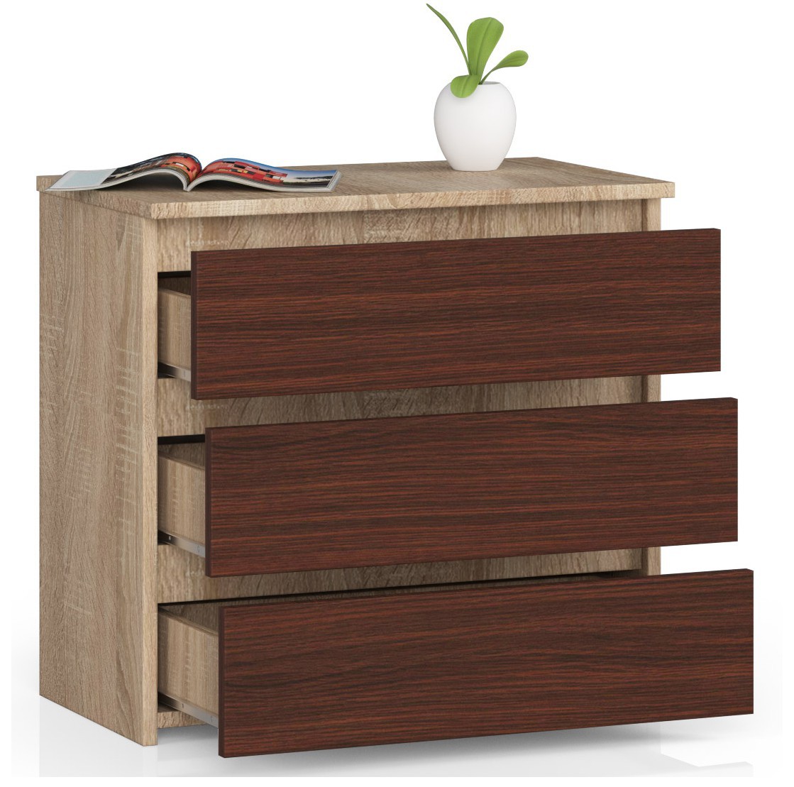 Miegamasis turėtų būti mūsų prieglobstis, vieta, kurioje galime atsipalaiduoti, jaustis atsipalaidavę ir patenkinti. Todėl labai svarbu šią vietą sutvarkyti ergonomiškai, estetiškai ir funkcionaliai, kad būtų užtikrintas maksimalus komfortas. Tam sukūrėme išrankiausių klientų poreikius atitinkančius baldus, tarp kurių yra ir naktiniai staleliai. Minimalistinis dizainas ir santūri spalva reiškia, kad pateiktą pasiūlymą tikrai įvertins paprastumą ir eleganciją mėgstantys klientai. , ąžuolo spalvos ąžuolo ir, tamsiai ruda spalvų naktinis staliukas yra įdomus pasiūlymas iš laminuotos plokštės, atsparios pažeidimams ir įbrėžimams. Dėl patvarios konstrukcijos, paprastos formos ir funkcionalumo šis baldas yra populiarus klientų pasirinkimas. – Komoda iš laminuotos plokštės, atsparios dilimui – Fasadai iš laminuotos plokštės – Stalčiai yra ant metalinių ritinėlių kreiptuvų – Matomi kraštai padengti ABS briauna – Savarankiškai surenkama komoda – Pridedamos instrukcijos – 24 mėnesių garantija