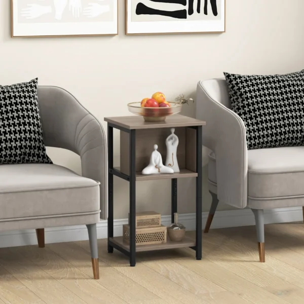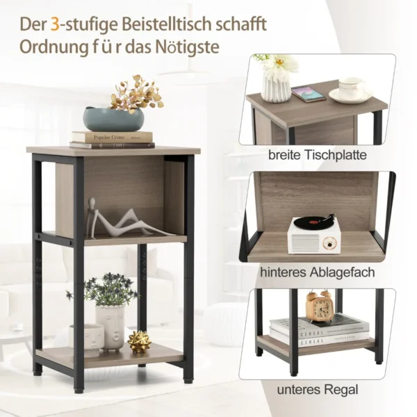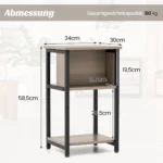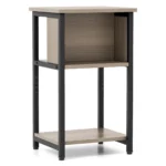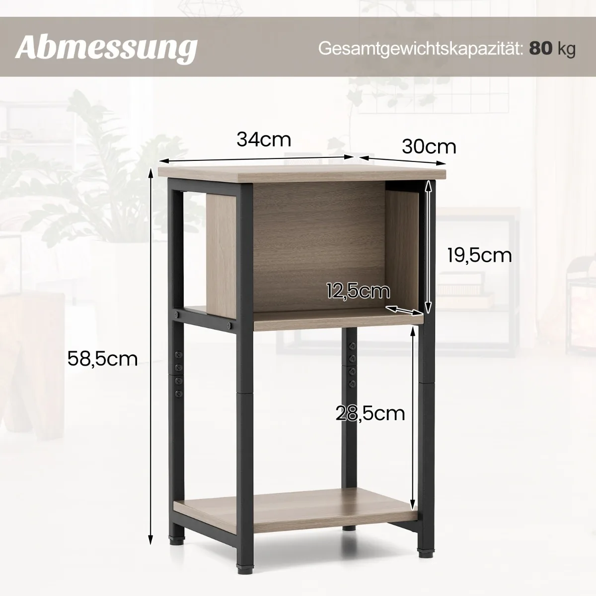 Naktinis staliukas 34x30x58,5 cm, šviesiai rudos ir juodos spalvos, puikiai tinka tiek miegamajam, tiek svetainei. Kompaktiškas trijų lygių dizainas suteikia pakankamai vietos laikyti įvairius daiktus ir leidžia efektyviai išnaudoti erdvę kambaryje.
