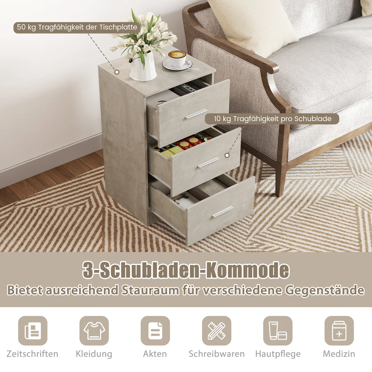 - Tinka naudoti miegamajame kaip naktinis staliukas arba svetainėje kaip komoda.