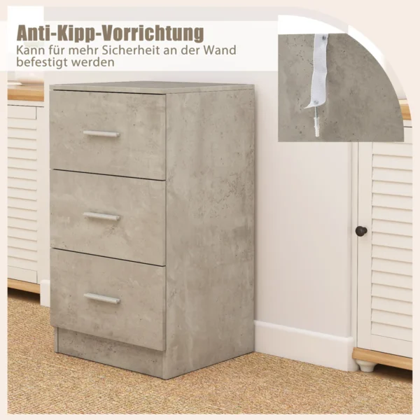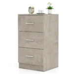 Naktinis staliukas 37x34x66,5 cm pilkos spalvos yra praktiškas sprendimas miegamajam ar svetainei. Pagamintas iš medžio drožlių plokštės, jis užtikrina patvarumą ir patogią kasdienę priežiūrą. Trijų stalčių dėka galima patogiai susidėti svarbiausius daiktus prie lovos.
