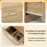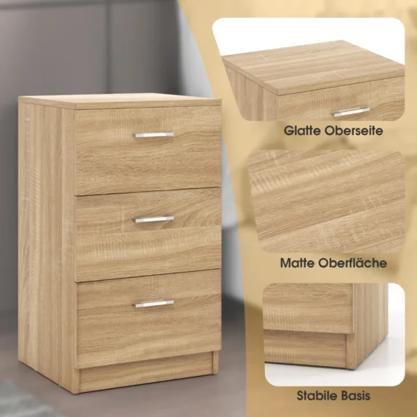 Naktinis staliukas 38x35x66 cm šviesiai rudos spalvos yra funkcionalus ir kompaktiškas baldas, tinkantis miegamajam ar kitoms namų erdvėms. Pagamintas iš medžio drožlių plokštės, jis užtikrina patvarumą ir lengvą priežiūrą. Trijų stalčių konstrukcija leidžia patogiai sandėliuoti kasdienius daiktus.