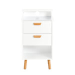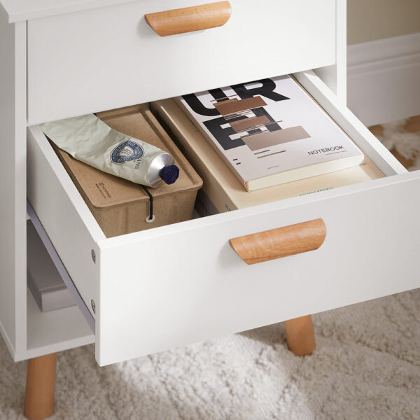 Staliukas turi dvi talpias stalčius ir du atvirus skyrius, kurie leidžia patogiai organizuoti įvairius daiktus. Be to, erdvi staliuko viršutinė dalis suteikia papildomos vietos dekoratyviniams elementams. Ergonomiška rankena užtikrina patogų stalčių atidarymą ir uždarymą.