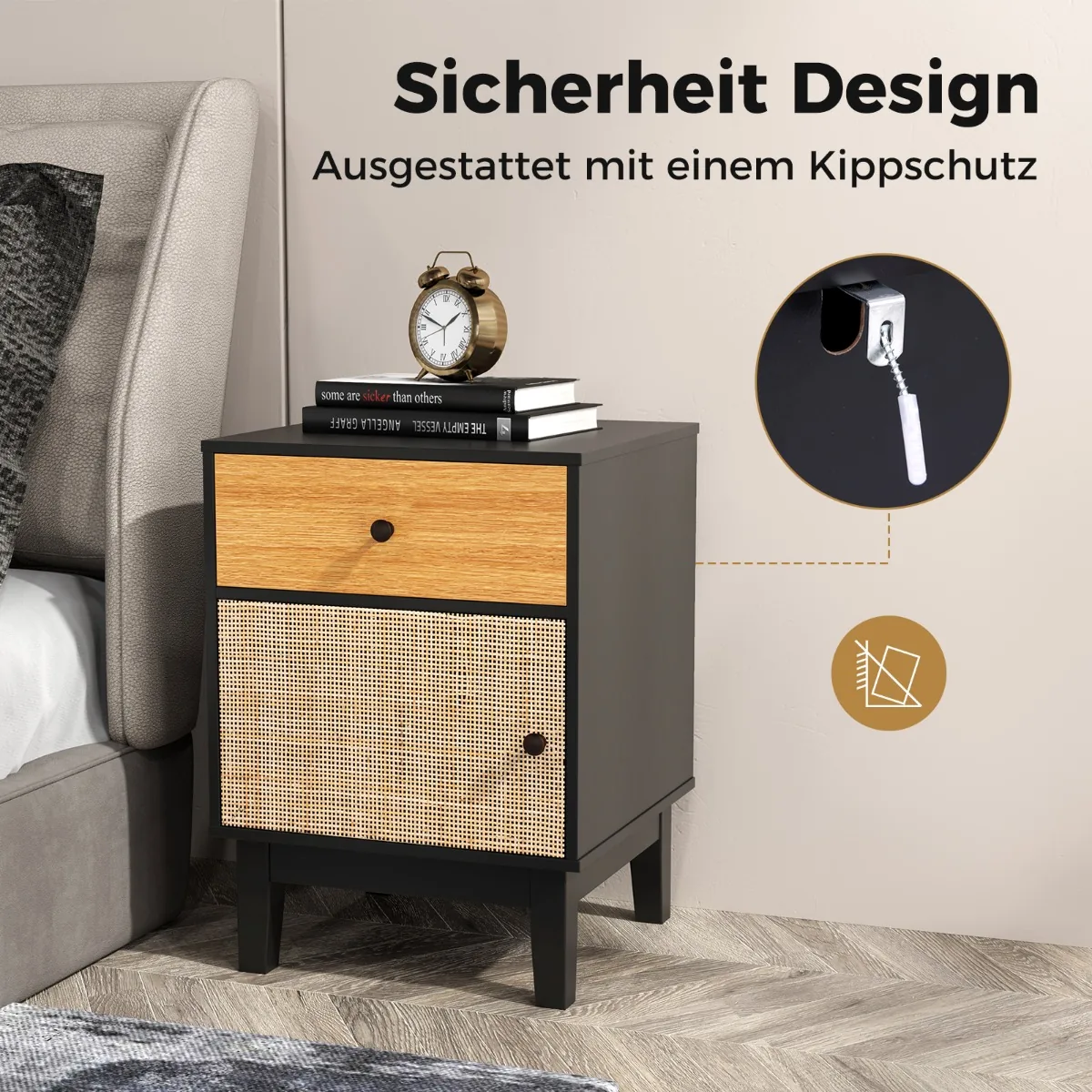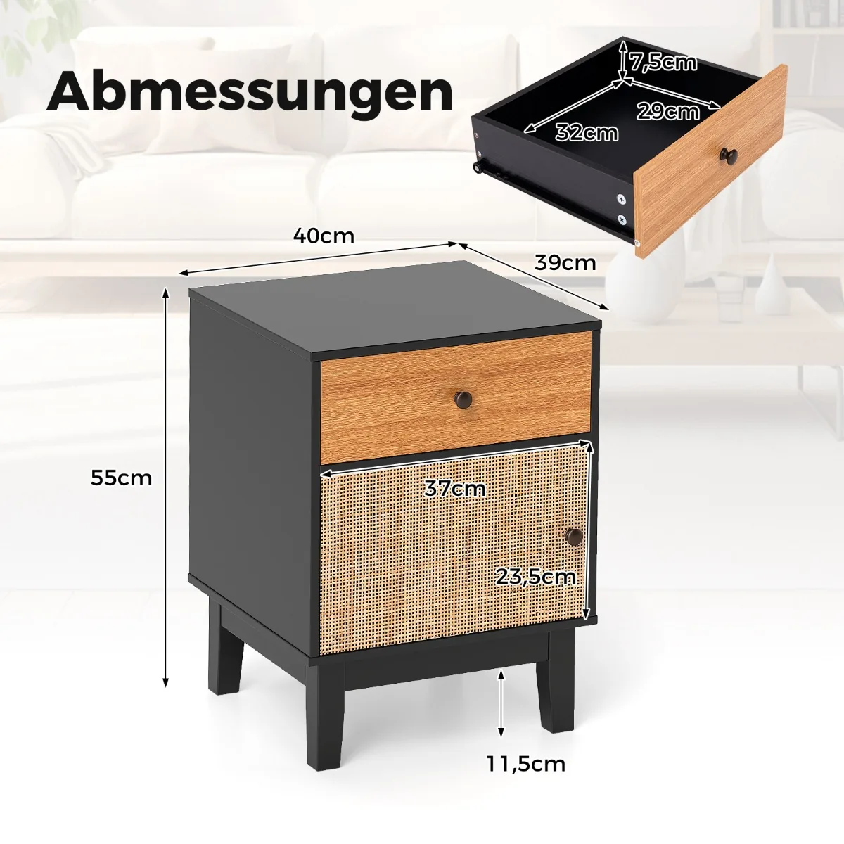 Naktinis staliukas 40x39x55cm, juodos ir šviesiai rudos spalvos, puikiai tiks jūsų miegamojo erdvei. Pagamintas iš natūralaus rotango ir medžio masyvo, jis suteikia pakankamai vietos daiktų laikymui bei užtikrina stabilumą ir patvarumą.