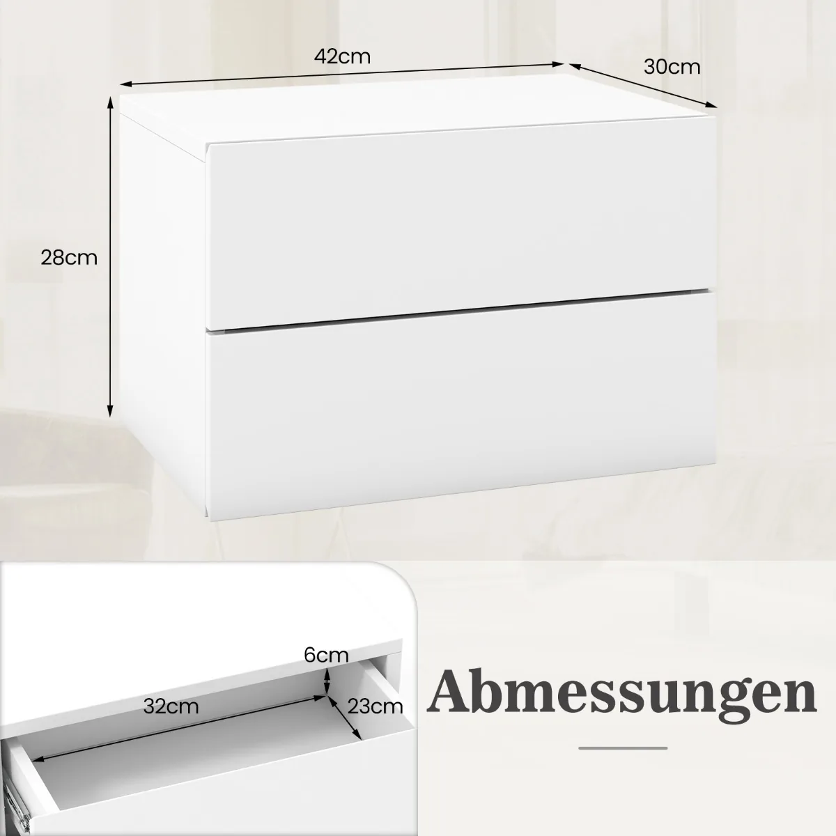 Naktinis staliukas 42x30x28cm, baltos spalvos, skirtas taupyti grindų erdvę ir užtikrinti patogų daiktų laikymą miegamajame, svetainėje ar darbo kambaryje. Prie sienos tvirtinamas dizainas leidžia lanksčiai pasirinkti aukštį ir palengvina patalpų valymą.