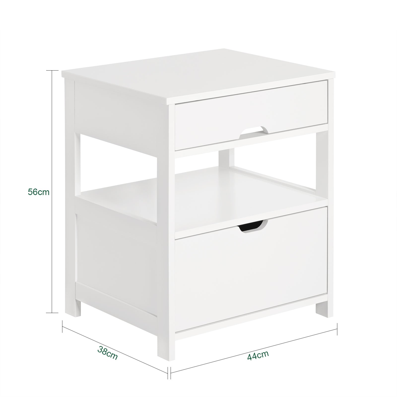 Šis elegantiškas naktinis staliukas 44x38x56 cm, baltos spalvos, yra puikus pasirinkimas jūsų miegamajam. Jo tvirta konstrukcija suteikia patikimą vietą žadintuvui, mėgstamai knygai ir kitiems daiktams, kuriuos norite turėti po ranka.