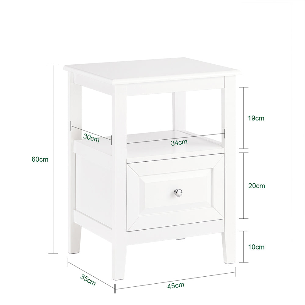 Šis naktinis staliukas 45x35x60 cm, baltos/sidabrinės spalvos, su minimalistiniu dizainu ir švariomis linijomis suteikia jūsų kambariui modernų stilių ir lengvai integruojasi į bet kokį interjerą.