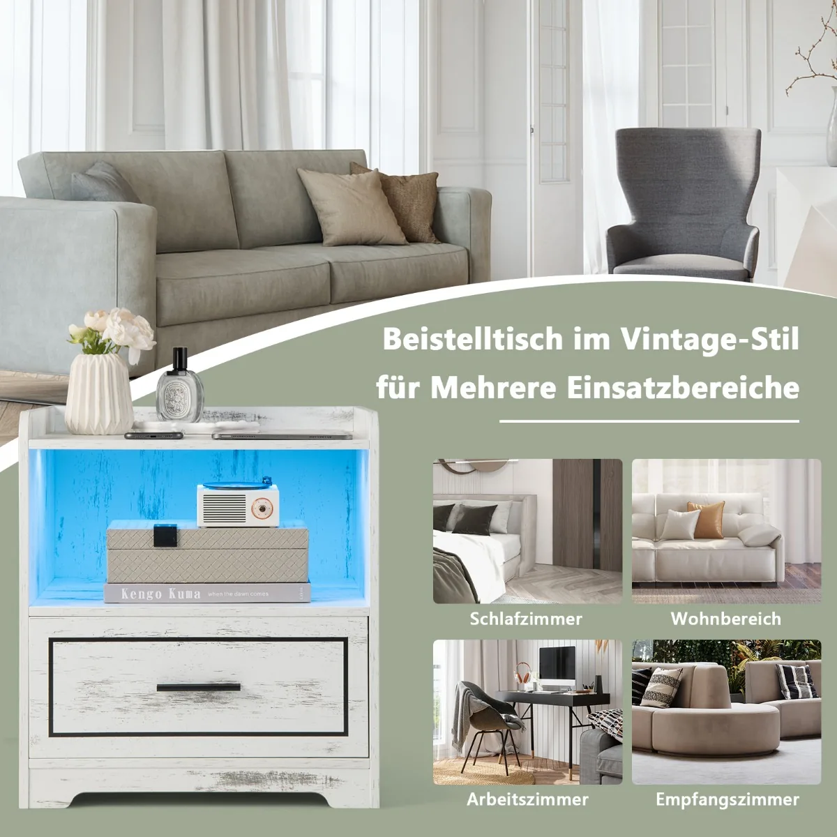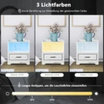 Naktinis staliukas 45x40x50cm, baltos spalvos, yra funkcionalus ir praktiškas sprendimas jūsų miegamojo interjerui. Šis LED apšviestas naktinis staliukas pasižymi erdvia saugojimo vieta bei išmaniosiomis apšvietimo ir įkrovimo funkcijomis. Jo konstrukcija ir matmenys užtikrina patogumą kasdieniniam naudojimui.