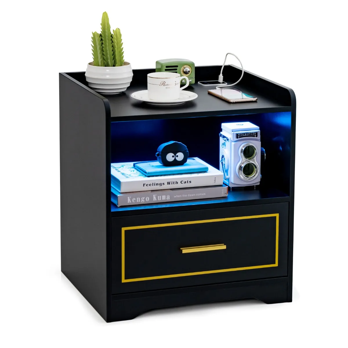 Naktinis staliukas 45x40x50cm juodos spalvos – funkcionalus ir patogus baldas jūsų miegamajam. LED apšvietimas su reguliuojamu ryškumu ir šviesos spalva bei judesio jutiklis užtikrina patogų naudojimą naktį. Staliukas pasižymi erdviu stalviršiu, atvira lentyna ir stalčiumi, suteikiančiais pakankamai vietos asmeniniams daiktams.
