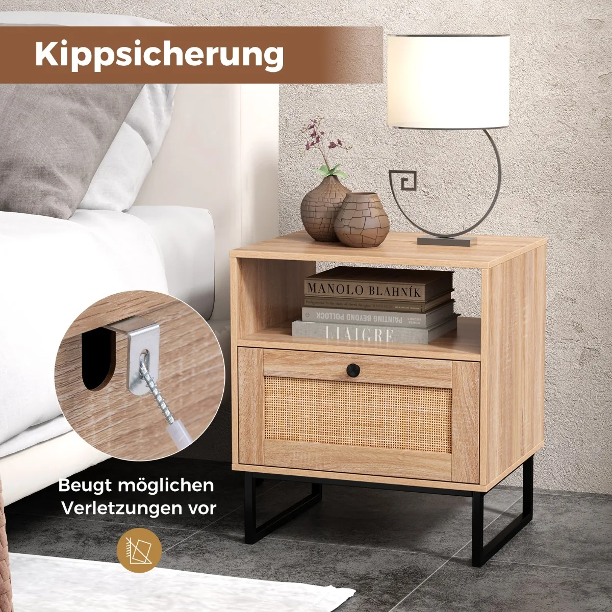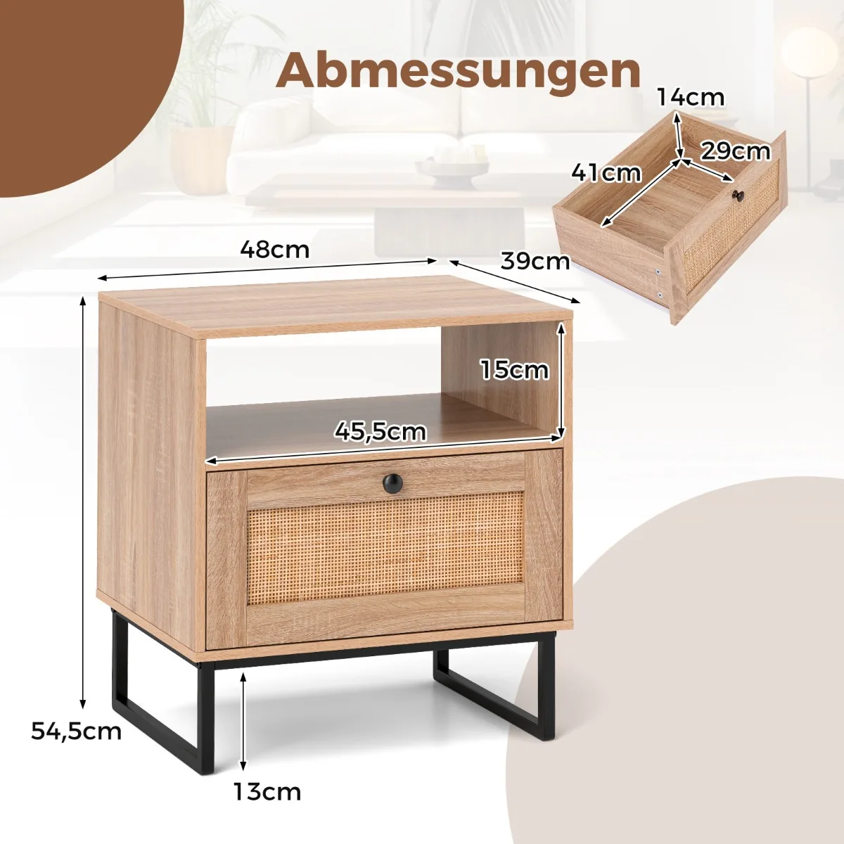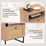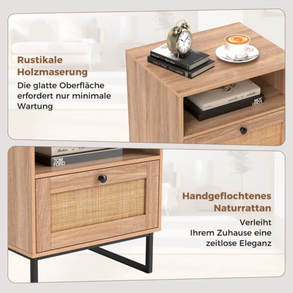Naktinis staliukas 48x39x54,5 cm, šviesiai rudos ir juodos spalvos, puikiai tinka miegamojo ar svetainės interjerui. Šis baldų elementas sujungia natūralaus rotango tekstūrą ir medienos raštą su funkcionaliu stalčiumi ir atviru skyriumi.