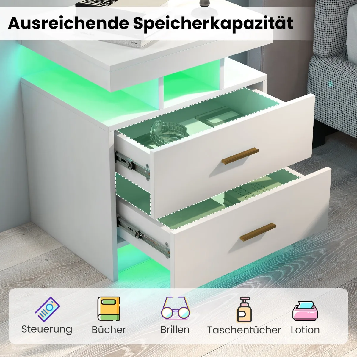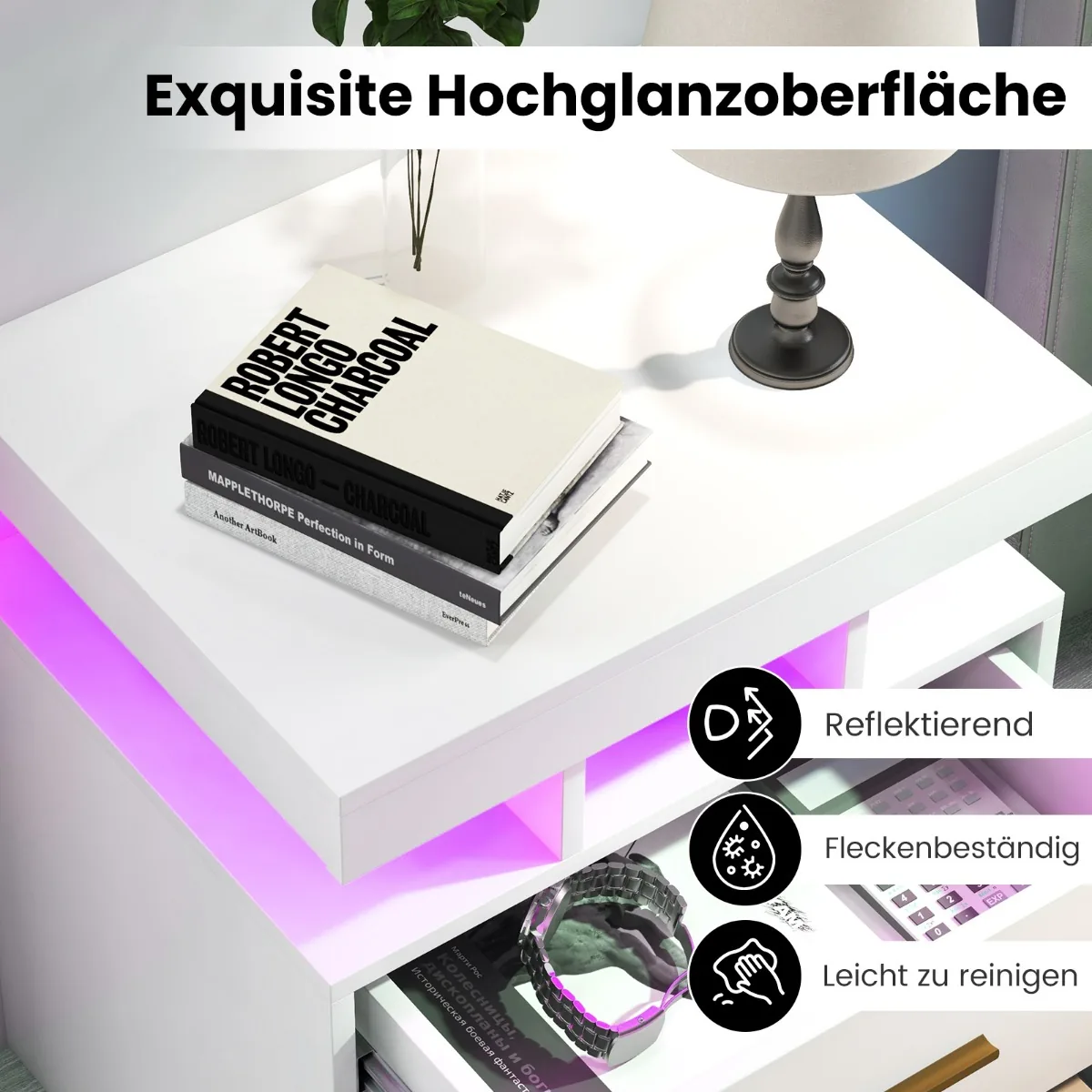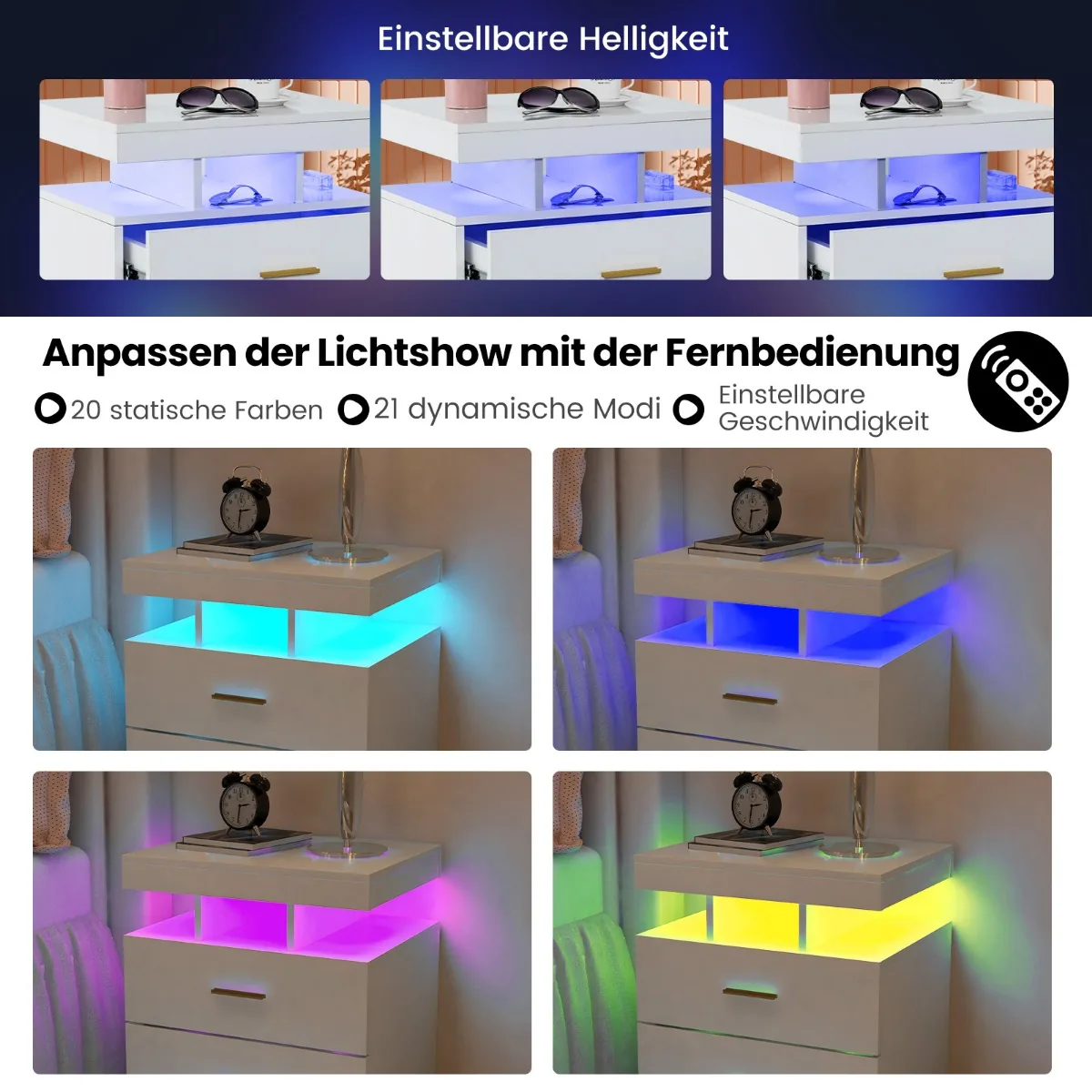 Naktinis staliukas 50x40x58 cm baltos spalvos puikiai tinka miegamajam, suteikdamas praktišką vietą daiktams laikyti ir papildomą apšvietimą. Integruotos LED lemputės su keliomis spalvų ir dinaminėmis režimų galimybėmis kuria švelnią atmosferą, o blizgi apdaila leidžia lengvai palaikyti švarą.