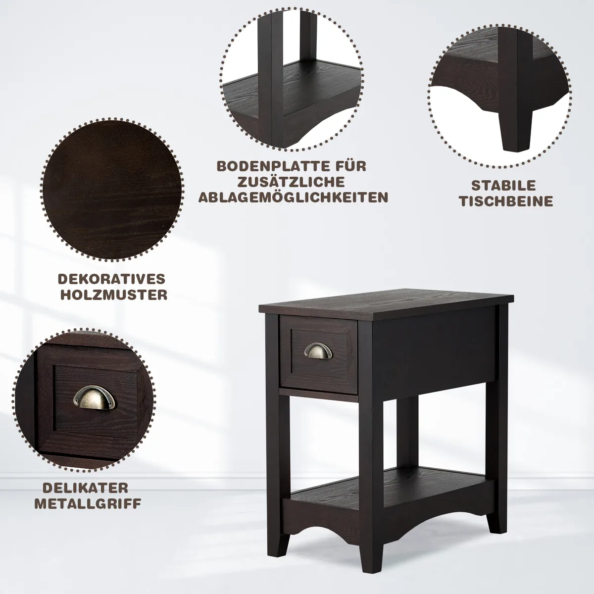 Naktinis staliukas 56x33x58,5 cm tamsiai rudos spalvos yra funkcionalus ir kompaktiškas baldas, skirtas patogiam daiktų laikymui ir interjero papildymui. Šis šoninis staliukas puikiai tinka tiek miegamajam, tiek svetainės ar darbo kambario erdvei.