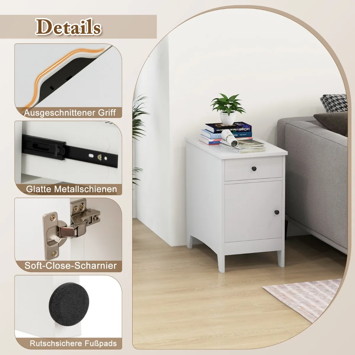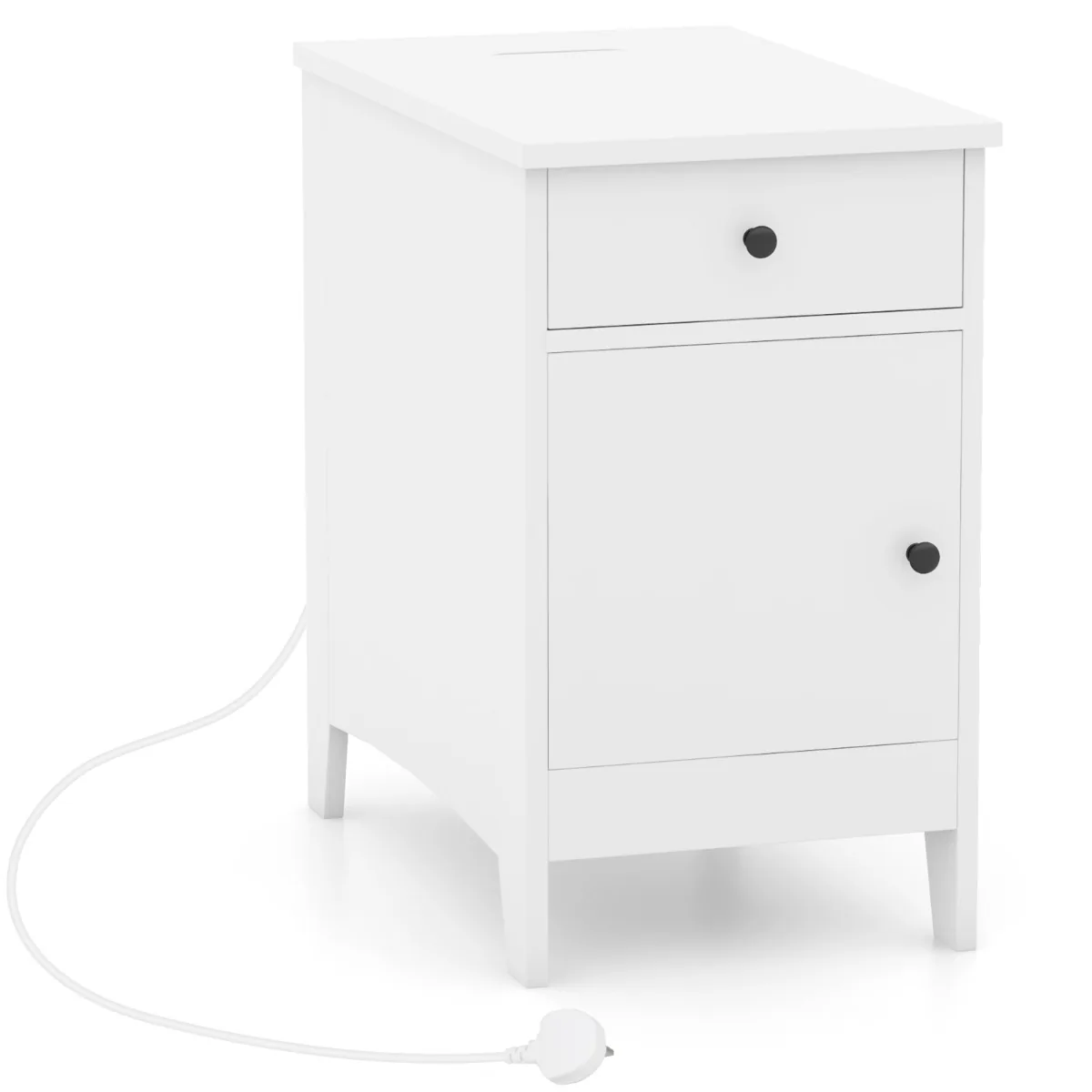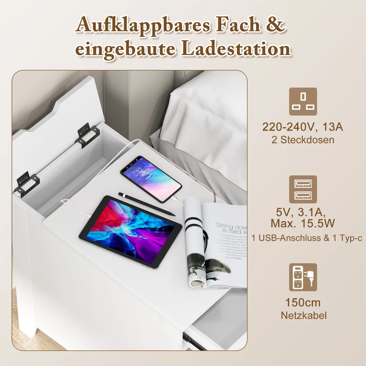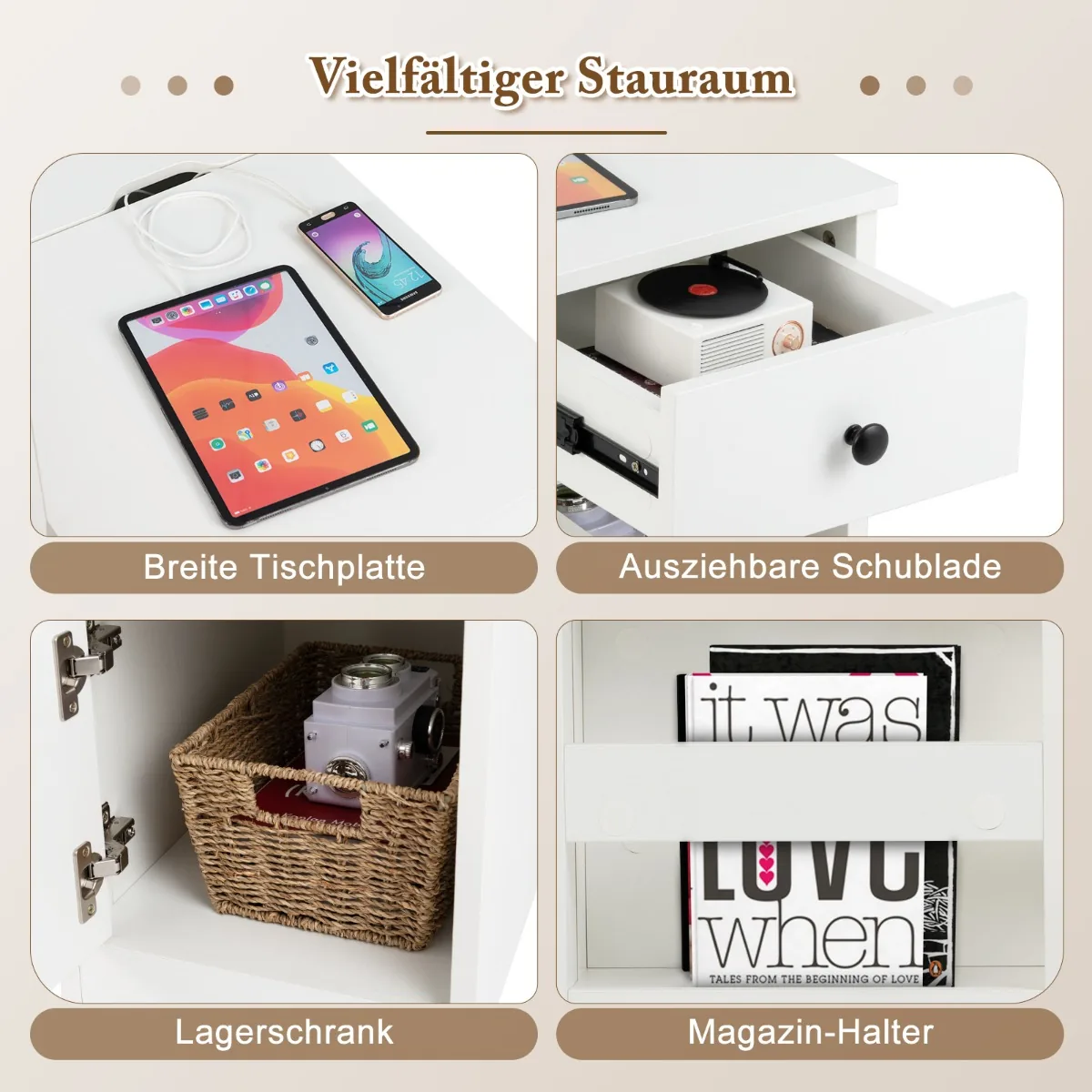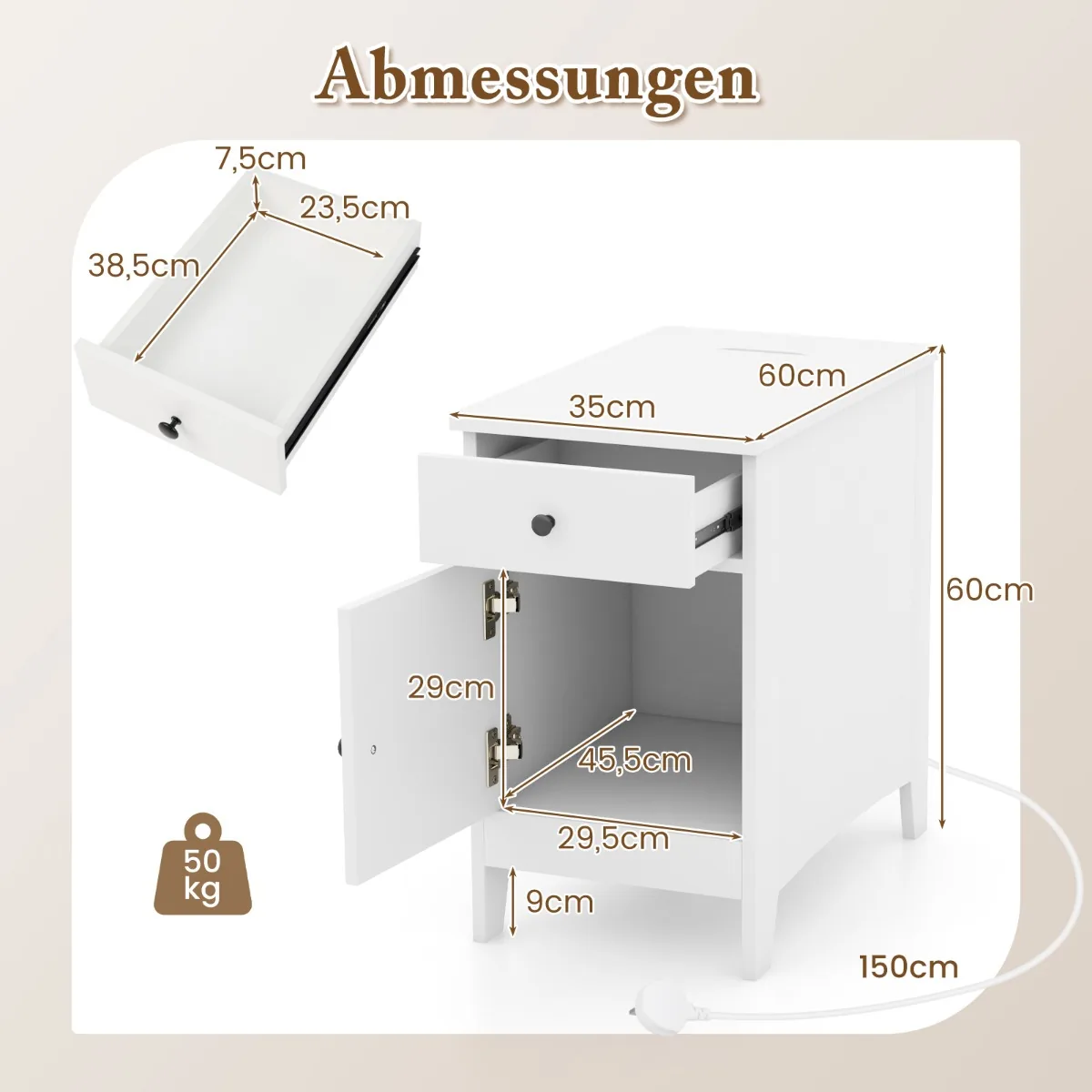 Naktinis staliukas 60x35x60cm baltos spalvos yra praktiškas sprendimas nedidelėms erdvėms. Integruoti USB prievadai ir elektros lizdai leidžia patogiai įkrauti elektroninius įrenginius be papildomų laidų. Staliukas turi ištraukiamą stalčių, spintelę ir žurnalų lentyną – visa, ko reikia tvarkingai laikyti kasdienius daiktus.