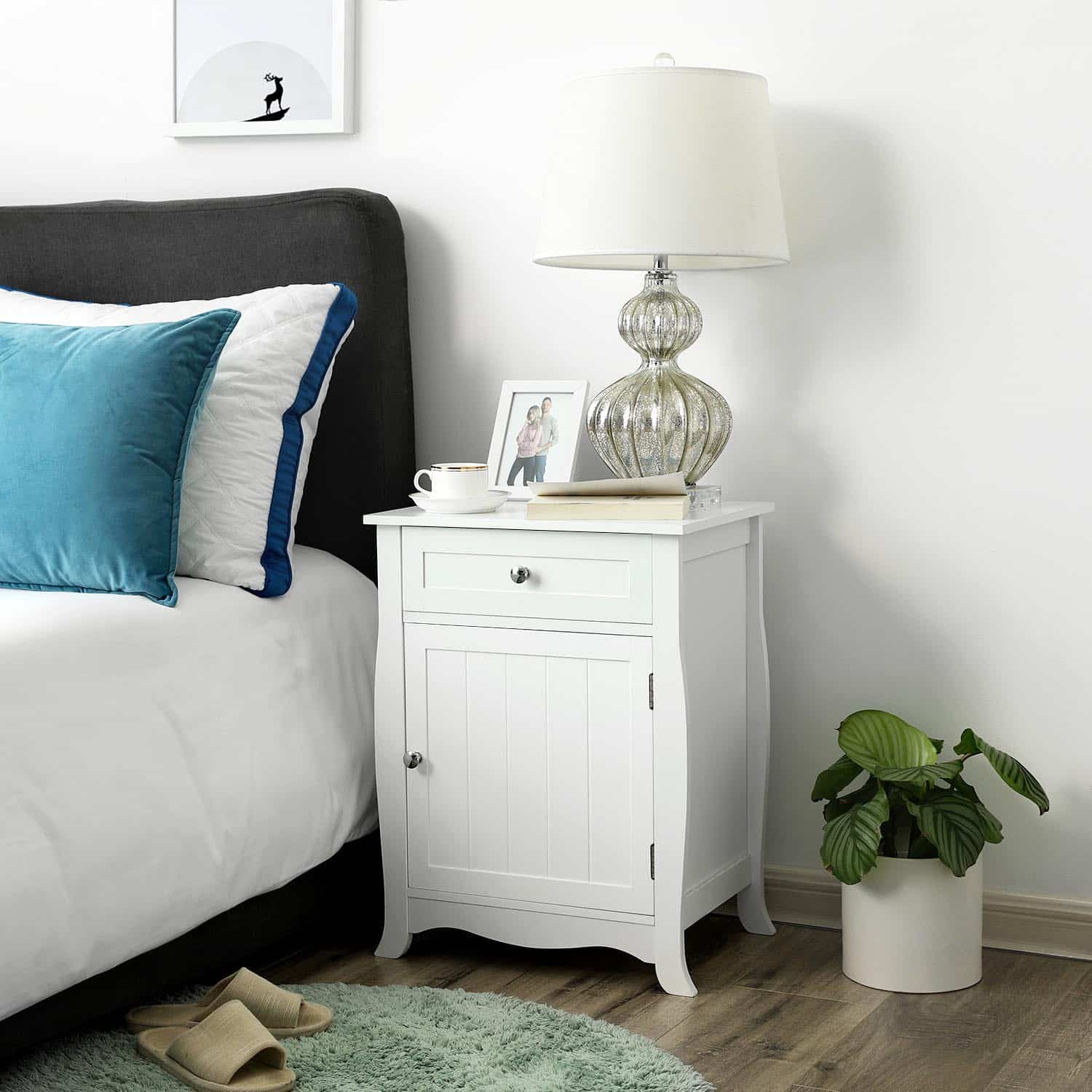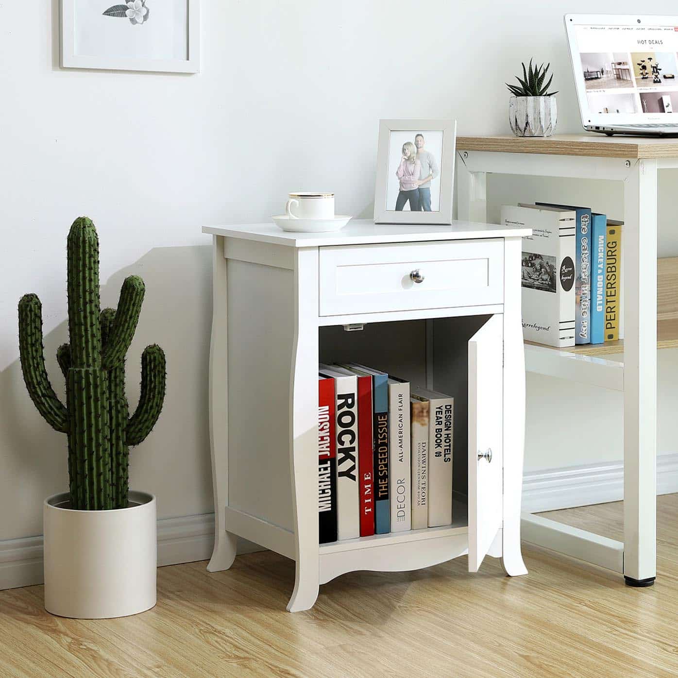 Dėl savo švaraus silueto ir blizgančių metalinių rankenėlių, šis staliukas idealiai tinka miegamajam, svetainei, vonios kambariui ir kt. Stalčius, stalviršis ir papildoma spintelė sukuria praktišką ir erdvų naktinį staliuką. Reikalingas surinkimas, tačiau su lengvai vykdomomis instrukcijomis ir sunumeruotomis dalimis, šis staliukas bus pastatytas akimirksniu.