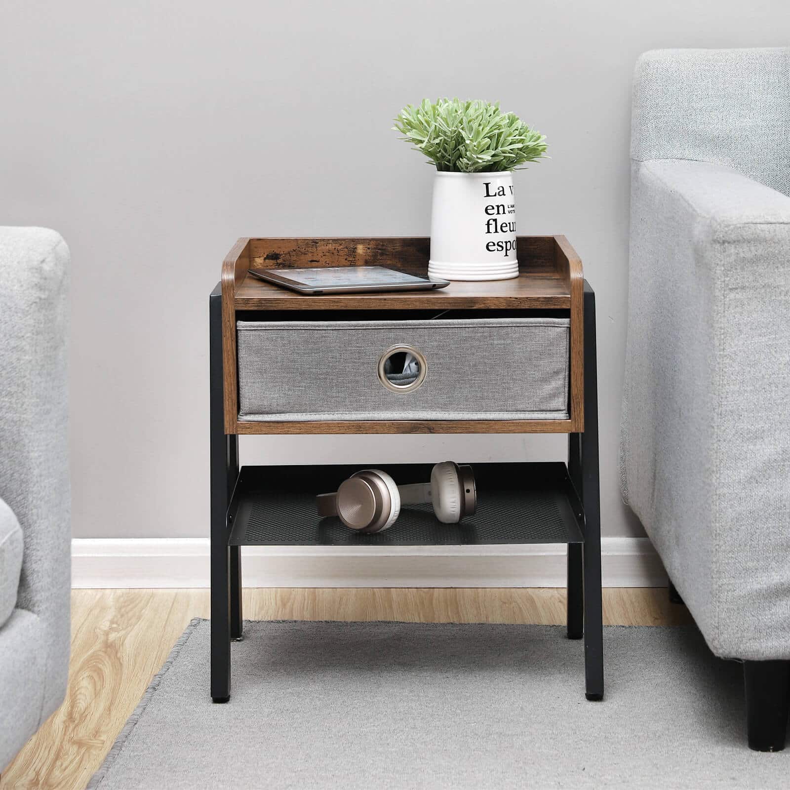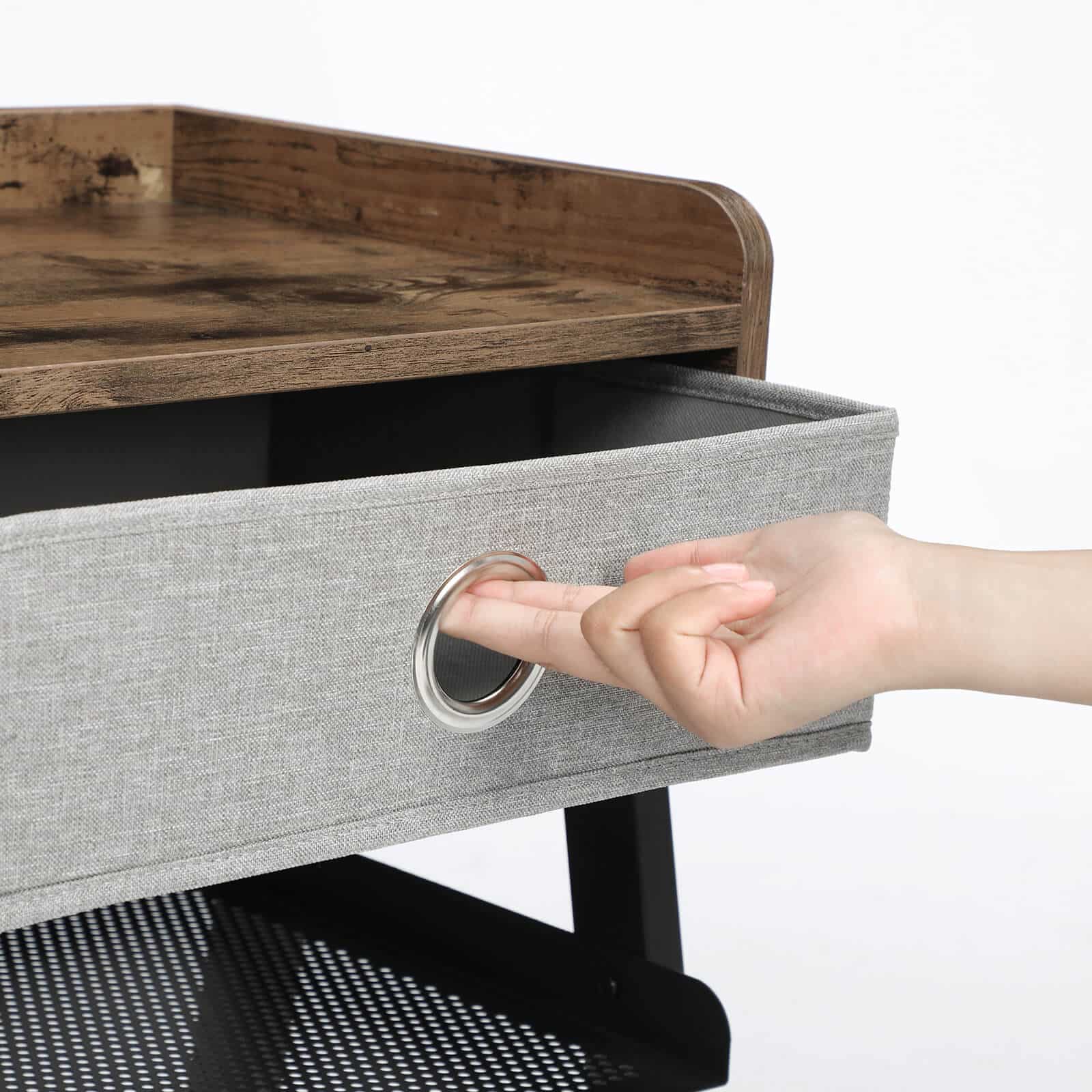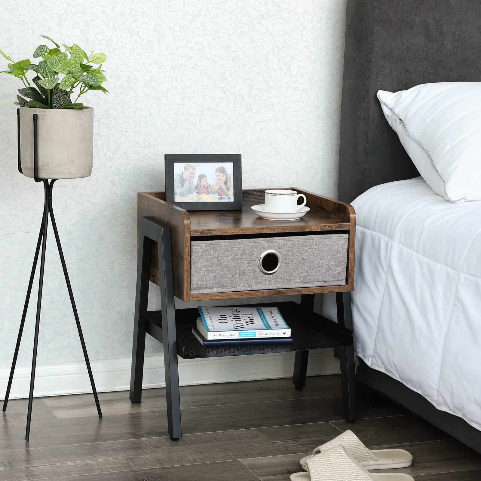 Didelė lentyna, išimamas medžiaginis stalčius ir grotelės suteikia daug vietos visiems daiktams, kurių reikia jūsų lovos rutinai. Kai ranka pasiekiamos servetėlės, lempa, mėgstamiausia knyga ar stiklinė vandens, naktis tampa daug malonesnė. Tiesiog apsiverskite ir paimkite reikalingą daiktą.