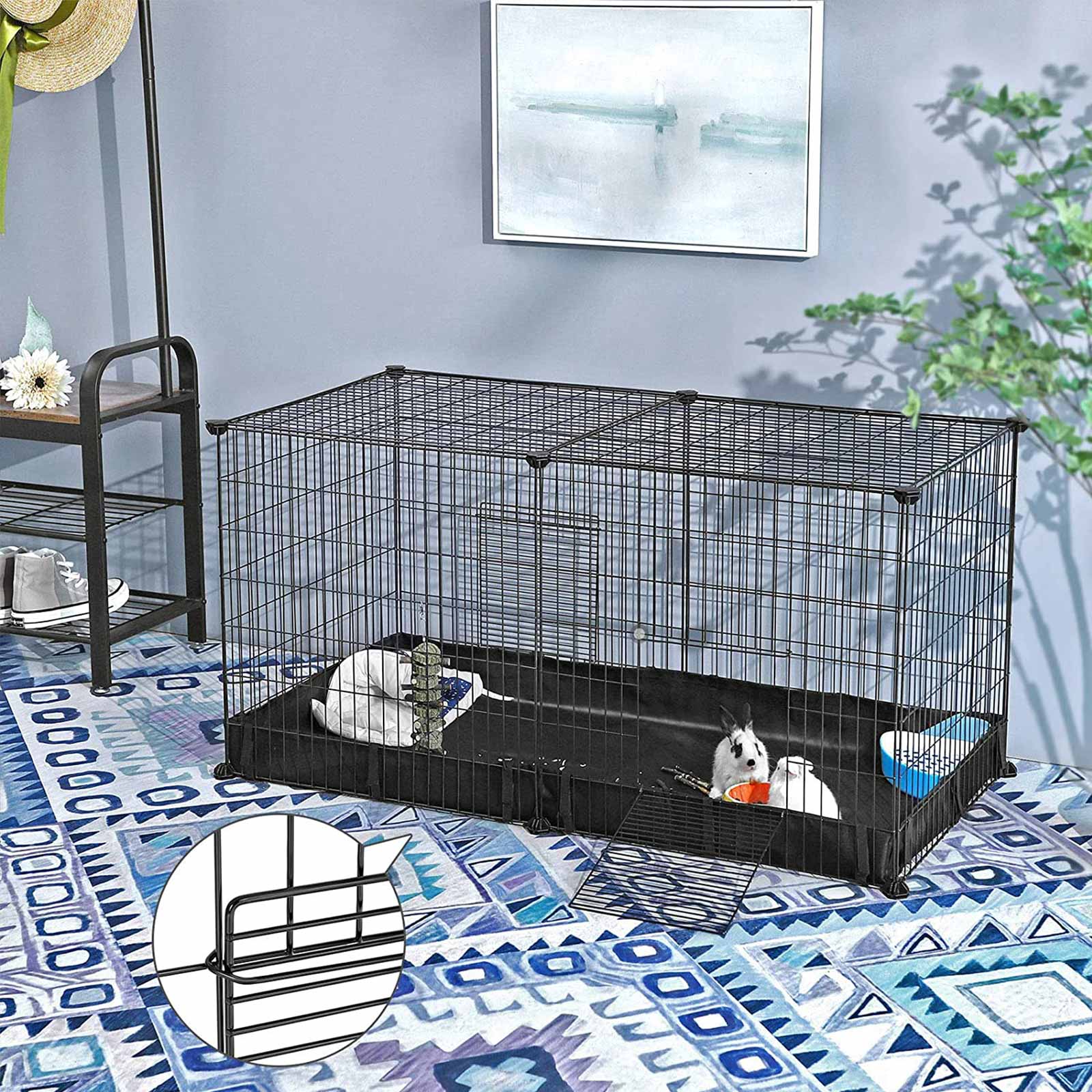 Bėgimas ir narvas viename: nors šis triušio namelis yra labai erdvus (123 x 63 x 61 cm), jis vis dar turi įprastas narvelio savybes. Dvi tinklelio plokštės uždaro aptvarą viršuje, kad jūsų triušis ar jūrų kiaulytė negalėtų pabėgti. Atidarykite dvi duris, jei norite suteikti savo augintiniui šiek tiek daugiau judėjimo laisvės. Tinkamai įrengtas su augintinio lova, hamaku ar namu, jūsų augintinis gali norėti likti namuose.