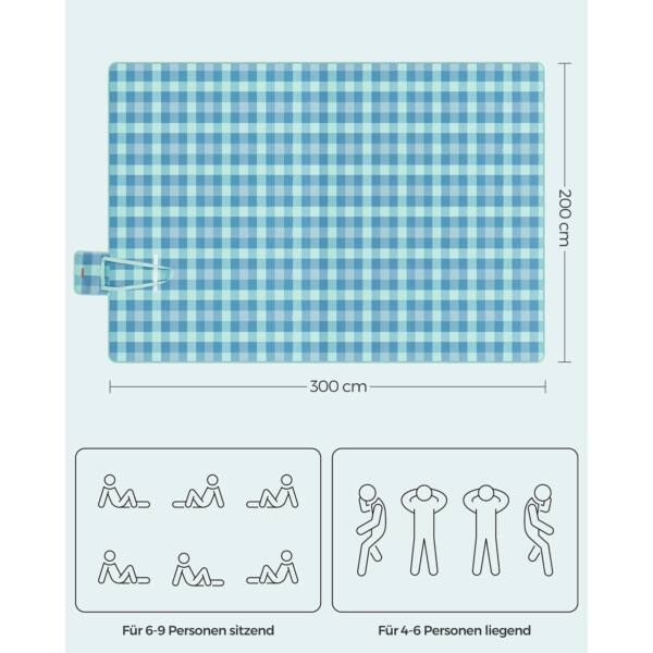 Neperšlampama pikniko antklodė 300 x 200 cm, žalios – mėlynos spalvos, yra puikus pasirinkimas lauko iškyloms, stovyklavimui ar poilsiui paplūdimyje. Ši antklodė yra pagaminta iš aukštos kokybės medžiagų, užtikrinančių komfortą ir ilgaamžiškumą.