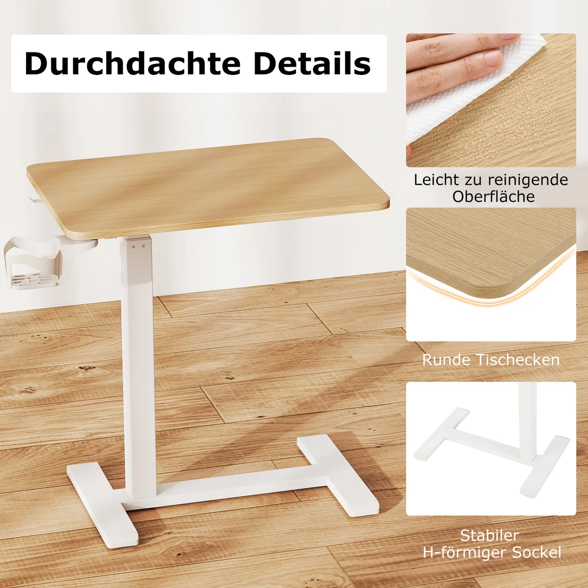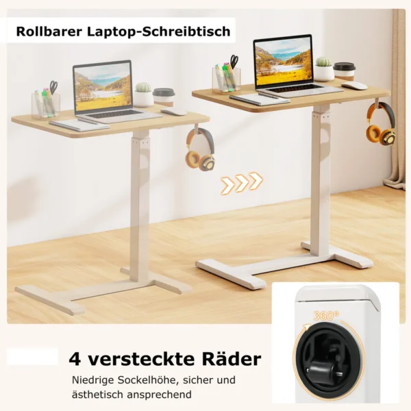 Nešiojamojo kompiuterio stalas 60x40x100cm, šviesiai rudos ir baltos spalvos, skirtas ergonomiškam darbui tiek sėdint, tiek stovint. Mobilus ir reguliuojamas stalas lengvai priglunda prie sofos ar lovos krašto, užtikrindamas patogią darbo vietą namuose ar biure.