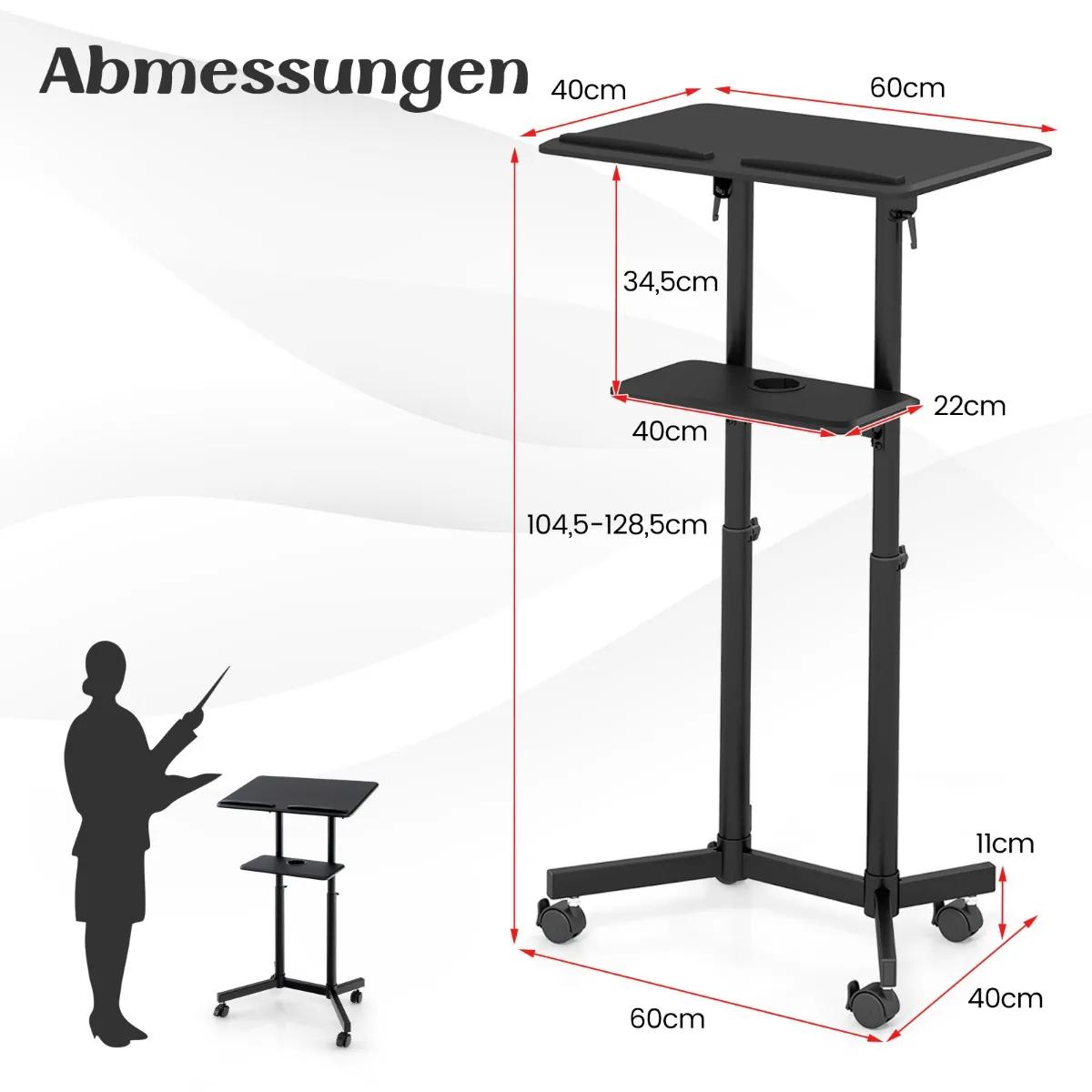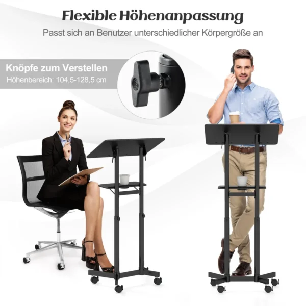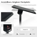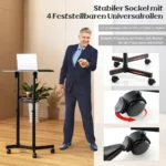Nešiojamojo kompiuterio stalas 60x40x128,5 cm juodos spalvos yra funkcionalus ir reguliuojamas sprendimas darbui ar pristatymams. Ergonomiškas stalviršis leidžia patogiai naudoti kompiuterį ar rašyti, o mobilumas užtikrina lengvą perkėlimą įvairiose erdvėse.