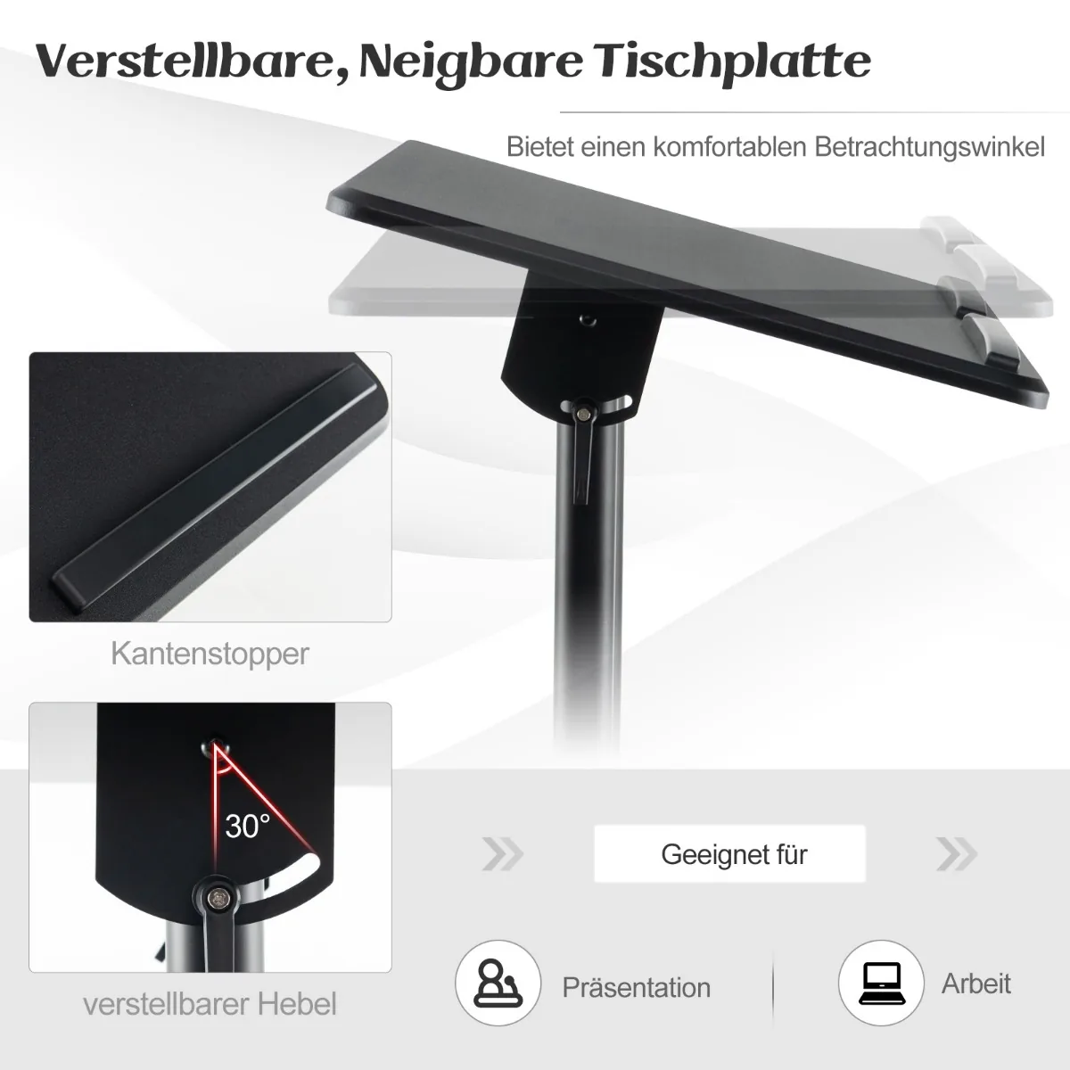 - Stalviršio paviršius pakreipiamas 0–30° kampu, leidžiantis rasti optimalų darbo ar pristatymo poziciją.