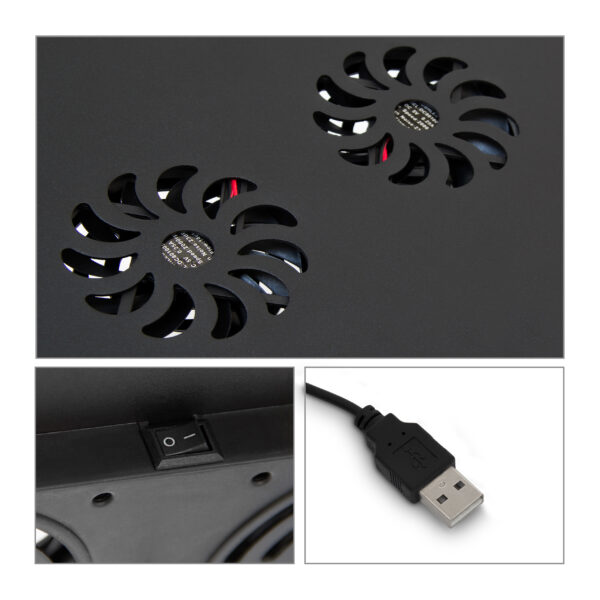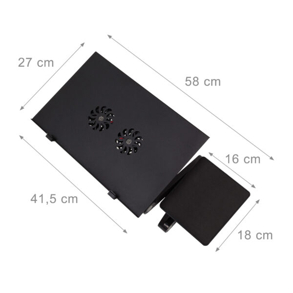 - Įmontuotas Ventiliatorius: Staliukas turi USB laidu maitinamą ventiliatorių, kuris apsaugo jūsų kompiuterį nuo perkaitimo, užtikrindamas ilgalaikį ir efektyvų veikimą.