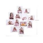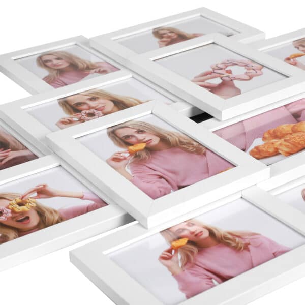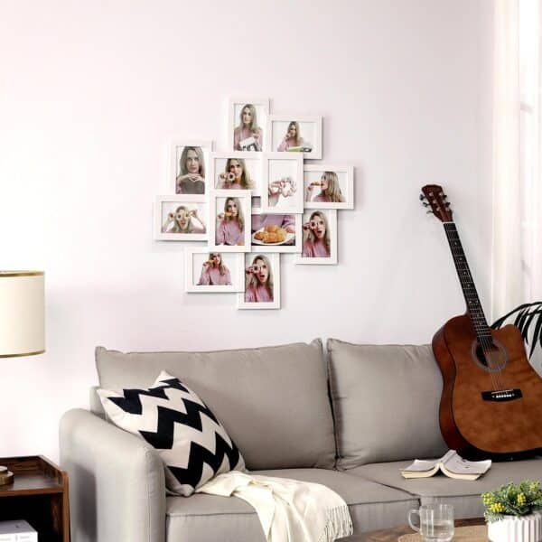 Prisiminimų kupinas paveikslų rėmelių koliažas. Šie elegantiški balti paveikslų rėmeliai papuoš jūsų svetainę, biurą, darbo kambarį ar miegamąjį gražiausiais prisiminimais. Įdėkite 12 nuotraukų į šiuos nuotraukų rėmelius ir pakabinkite ant tuščios sienos, kad galėtumėte pasidalyti įdomiausiomis akimirkomis su svečiais. Be to, jūsų nuotraukos yra gerai apsaugotos tarp medžio plaušo plokštės ir stiklo plokštės.