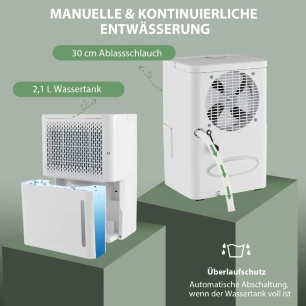 - Automatinis išsijungimas, kai vandens bakas pilnas, taip pat galimybė prijungti išleidimo žarną nuolatiniam drenavimui.