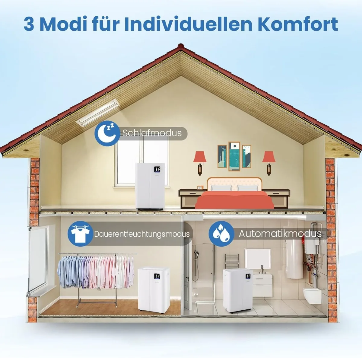 - Sausintuvas skirtas patalpoms iki 25 m², veikia efektyviai palaikant drėgmės lygį nuo 30 % iki 80 %.