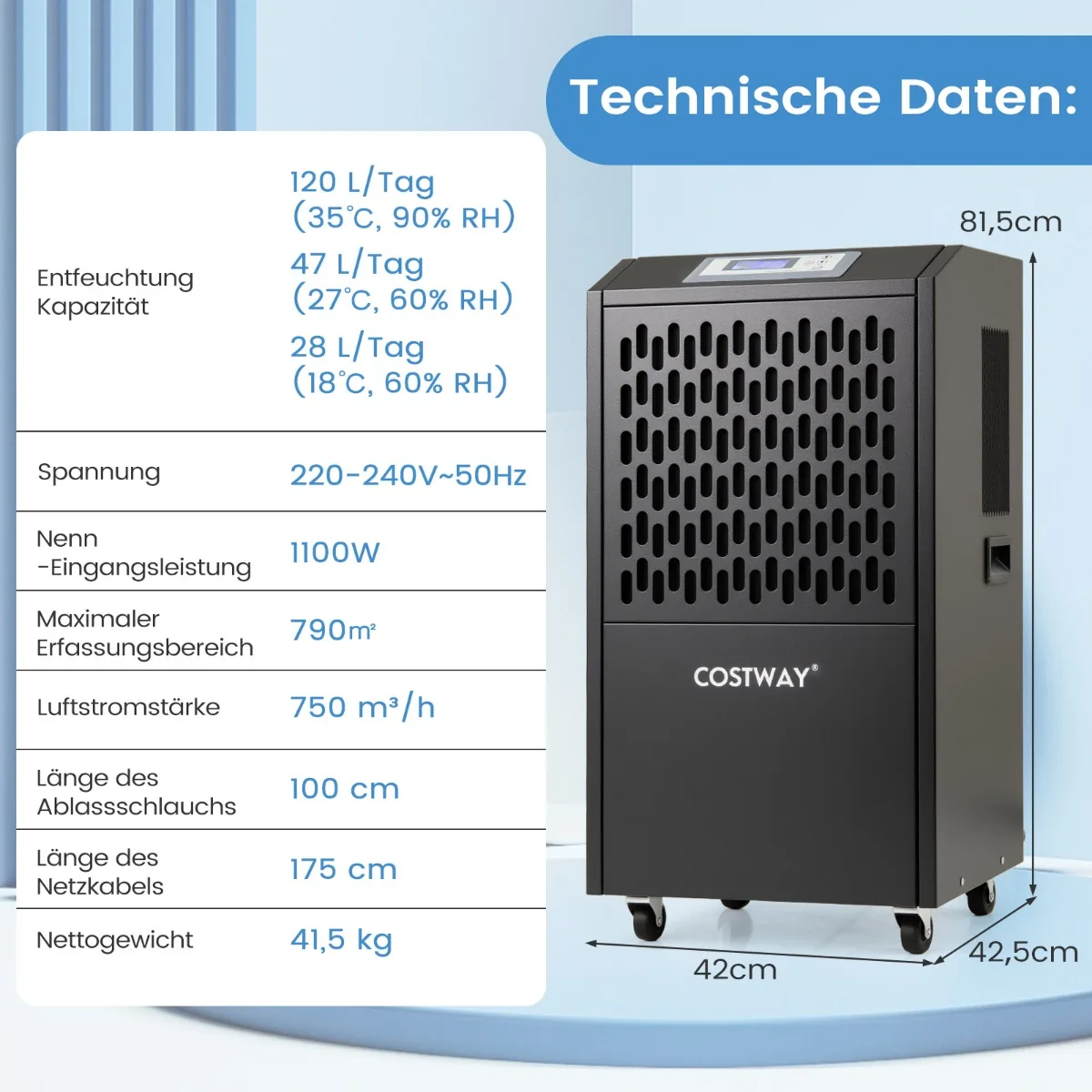 Oro sausintuvas 42,5x42x81,5 cm juodos spalvos yra skirtas efektyviam drėgmės šalinimui didelėse patalpose. Šis komercinis oro sausintuvas tinka iki 790 m² ploto, užtikrindamas maksimalų oro srautą ir didelį drėgmės pašalinimo pajėgumą.