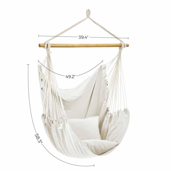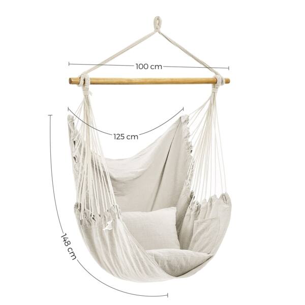 Ši pakabinama kėdė su 2 pagalvėlėmis ir metaline grandinėle yra puikus pasirinkimas jūsų poilsiui. Jos smėlio spalva suteikia elegancijos ir jaukumo bet kuriai erdvei.