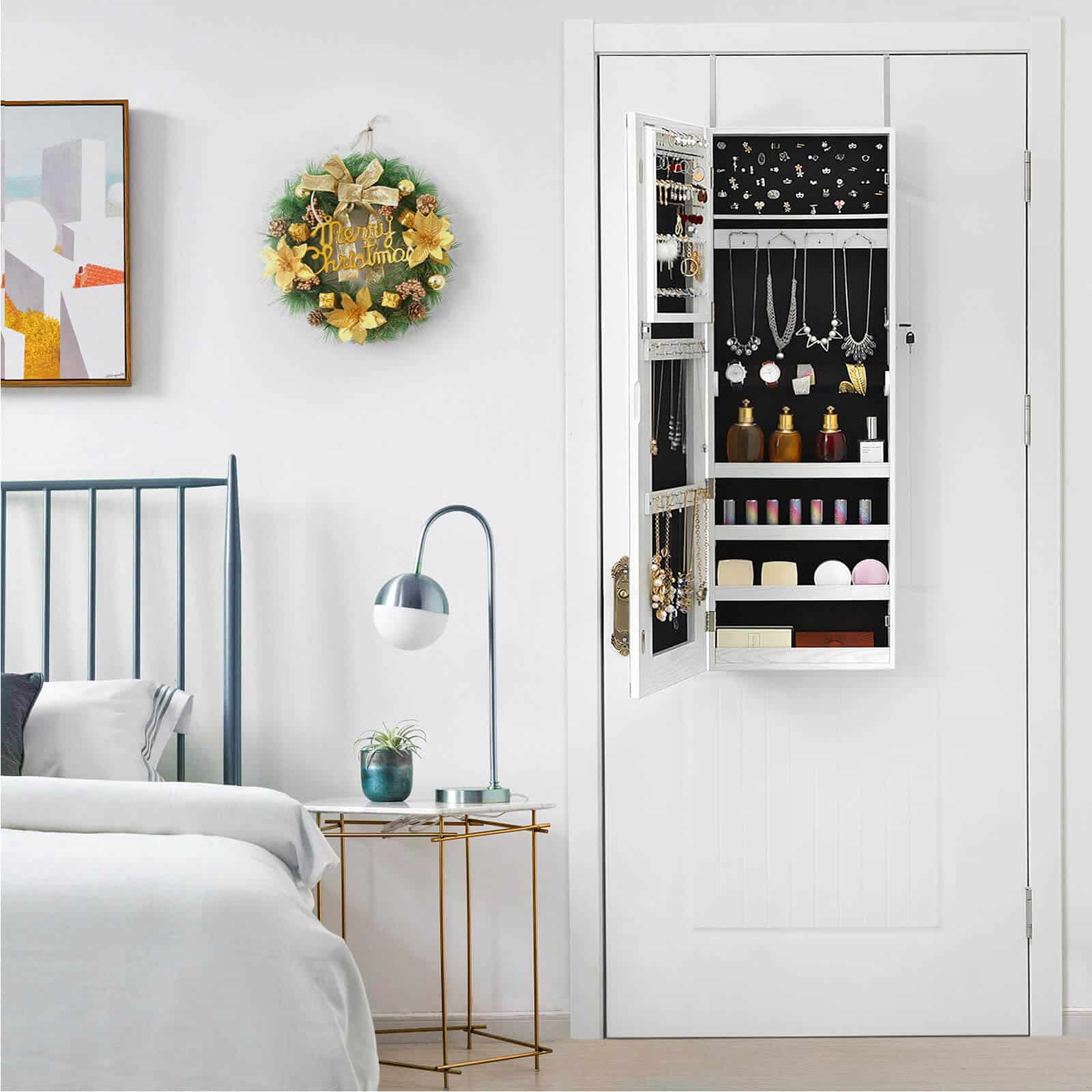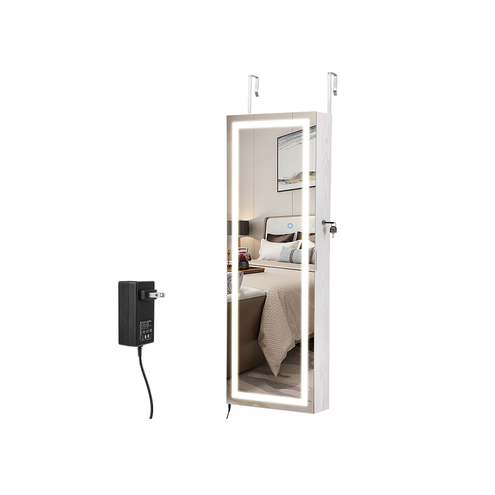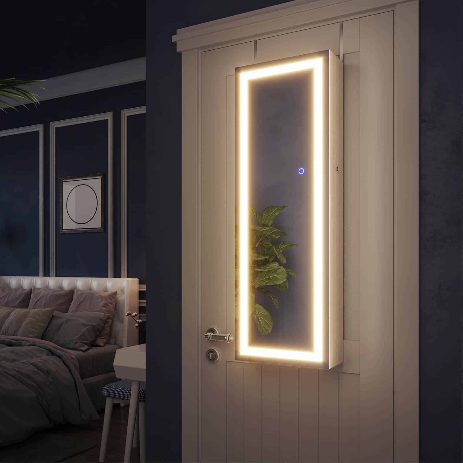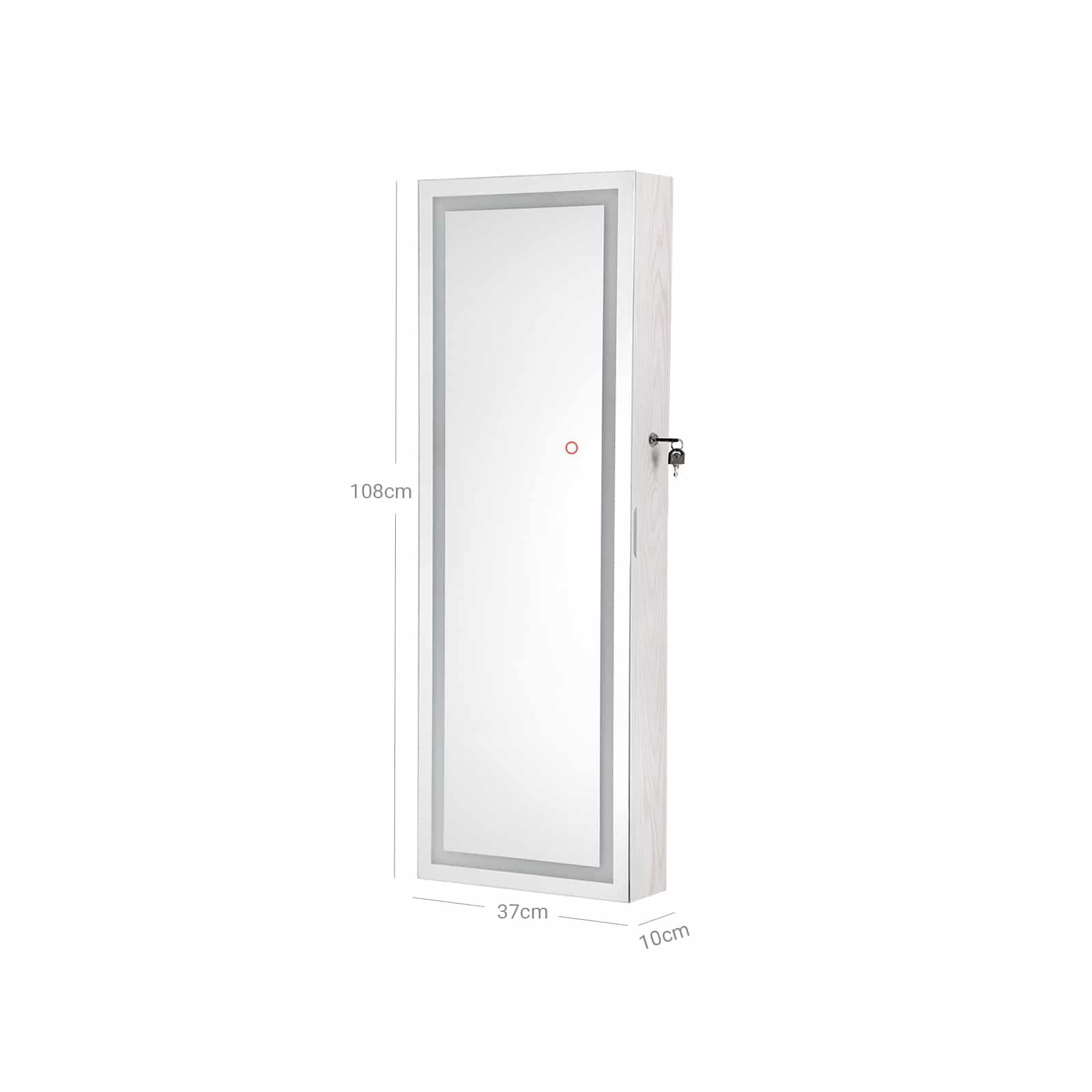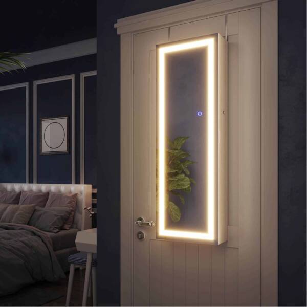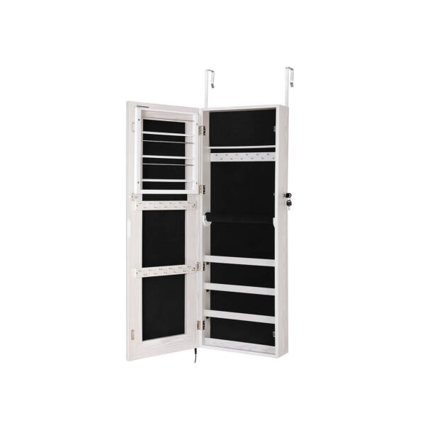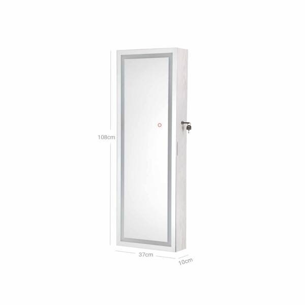 Jos nauja raudona suknelė tinka kaip pirštinė. Apsiaukite aukštakulnius ir grožėkitės savo apranga dideliame, apšviestame šios akį traukiančios pakabinamos papuošalų spintelės su apšvietimu aplink veidrodį veidrodyje. Apšvietimą galima pritemdyti palietus veidrodį. Tačiau, jei norite panagrinėti savo makiažą, rekomenduojama pasirinkti ryškiausią apšvietimo lygį. Sustokite! Vis dar kažko trūksta! Derantys auskarai ir blizgantis vėrinys užbaigia jūsų stilių. Laimei, jums nereikia ilgai ieškoti tinkamų papuošalų, nes jie yra tvarkingai išrikiuoti už veidrodinės spintelės durų.