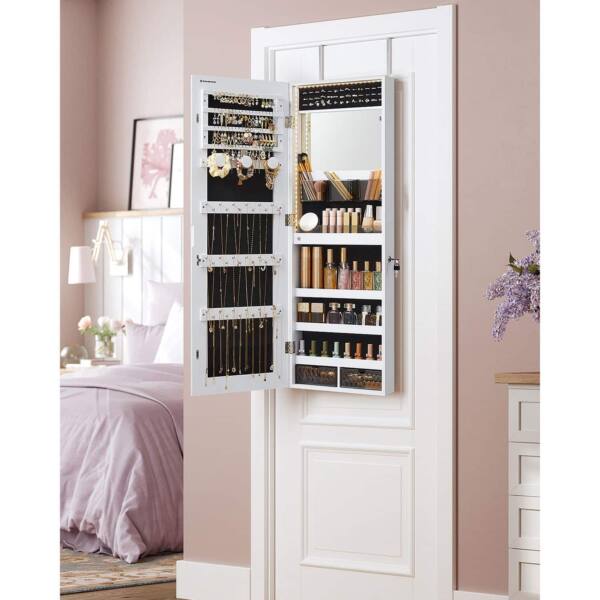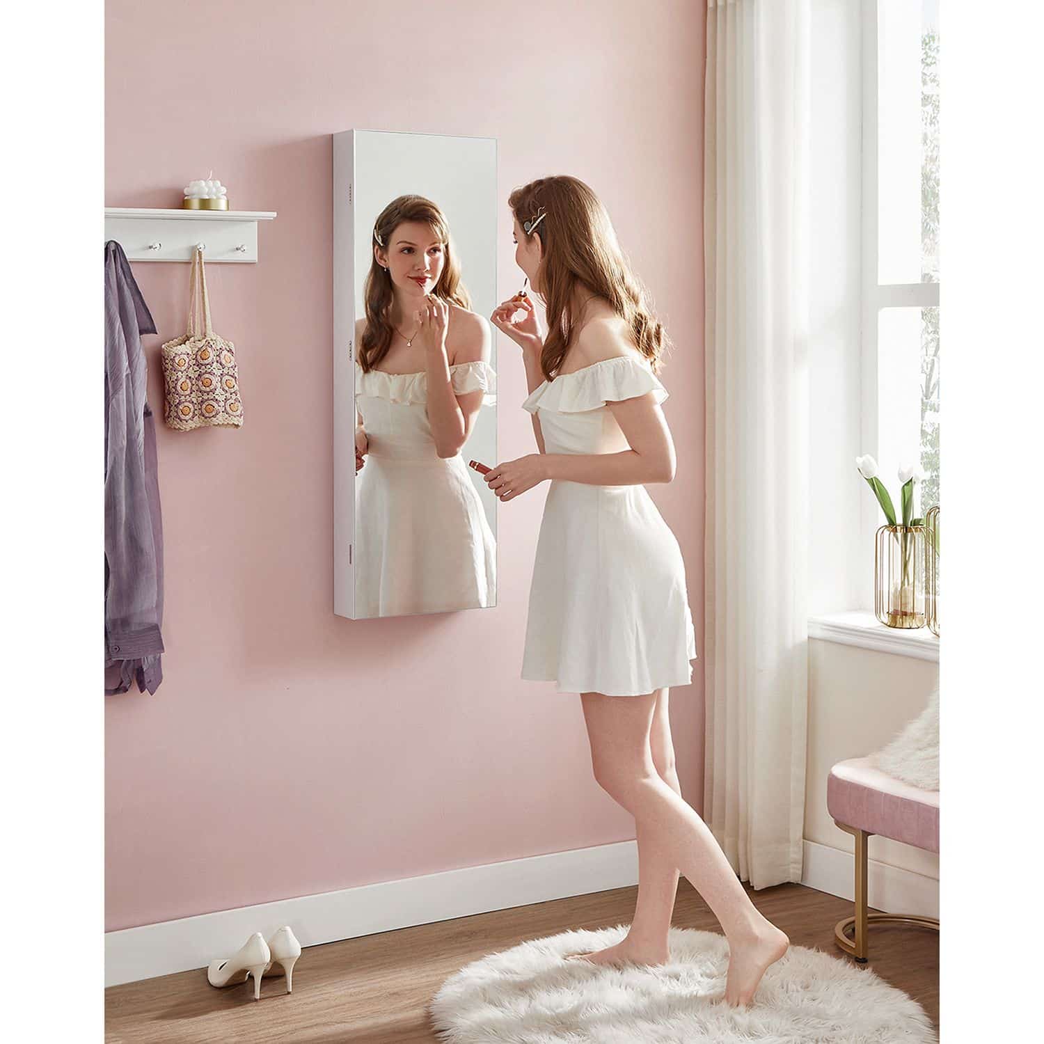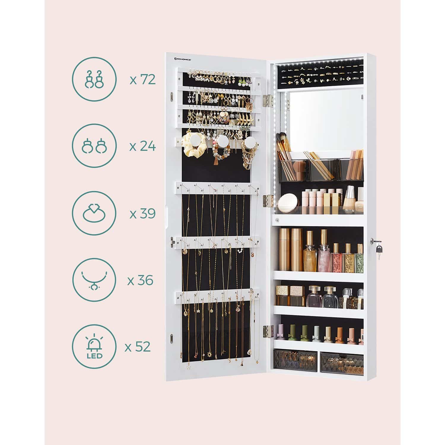 Ši pakabinama papuošalų spintelė su veidrodžiu, baltos spalvos, yra puikus sprendimas jūsų papuošalų laikymui ir organizavimui. Ji ne tik funkcionali, bet ir stilinga, todėl puikiai tiks bet kuriame interjere.