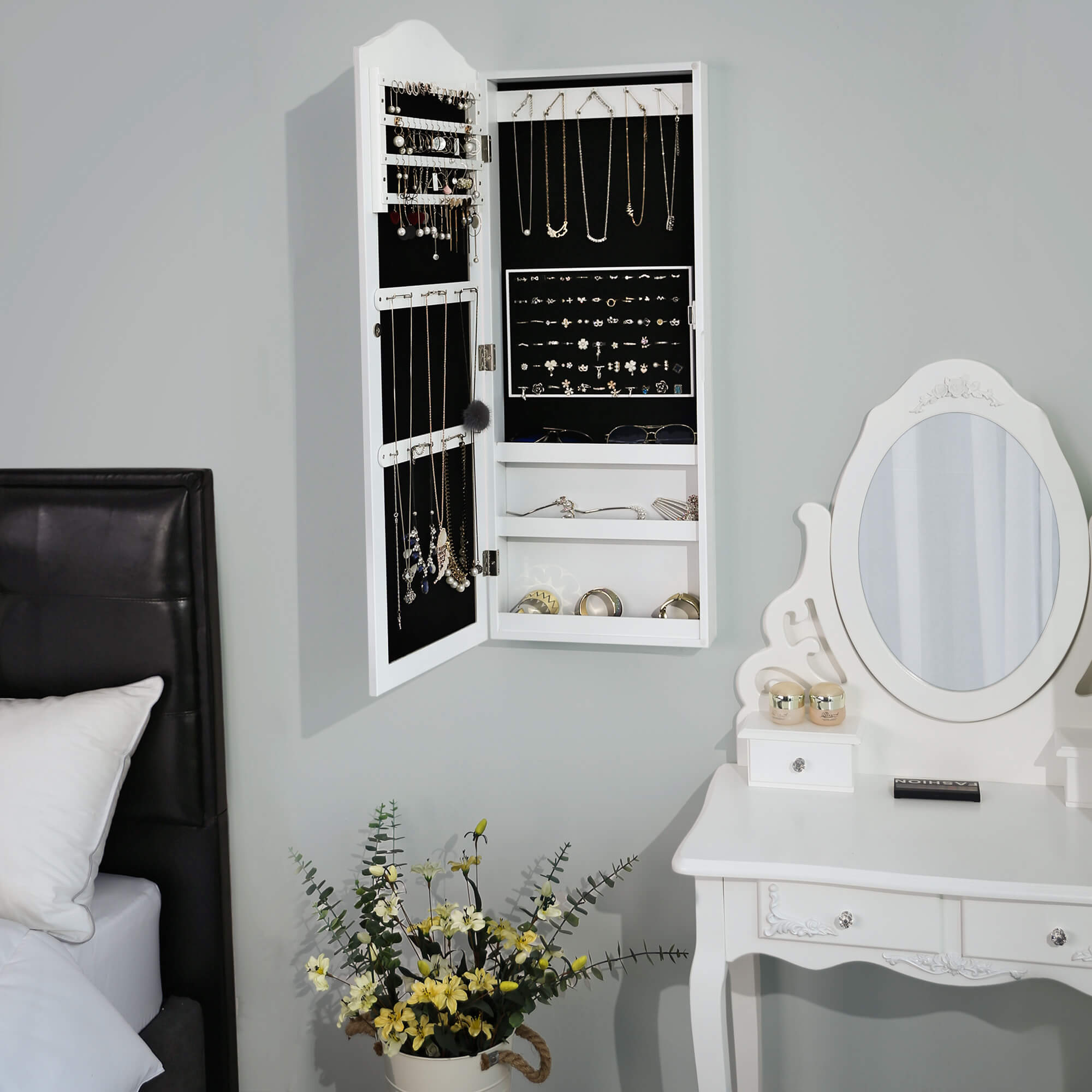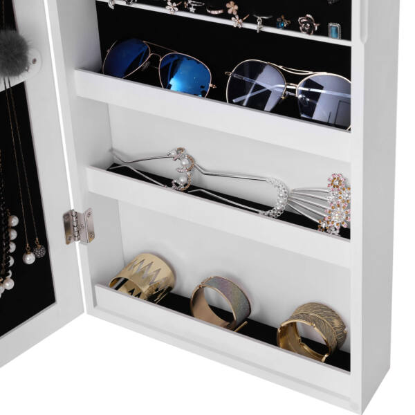 Ši papuošalų spintelė su veidrodžiu yra ne tik funkcionali, bet ir estetiškai patraukli, todėl puikiai tiks bet kuriame kambaryje.
