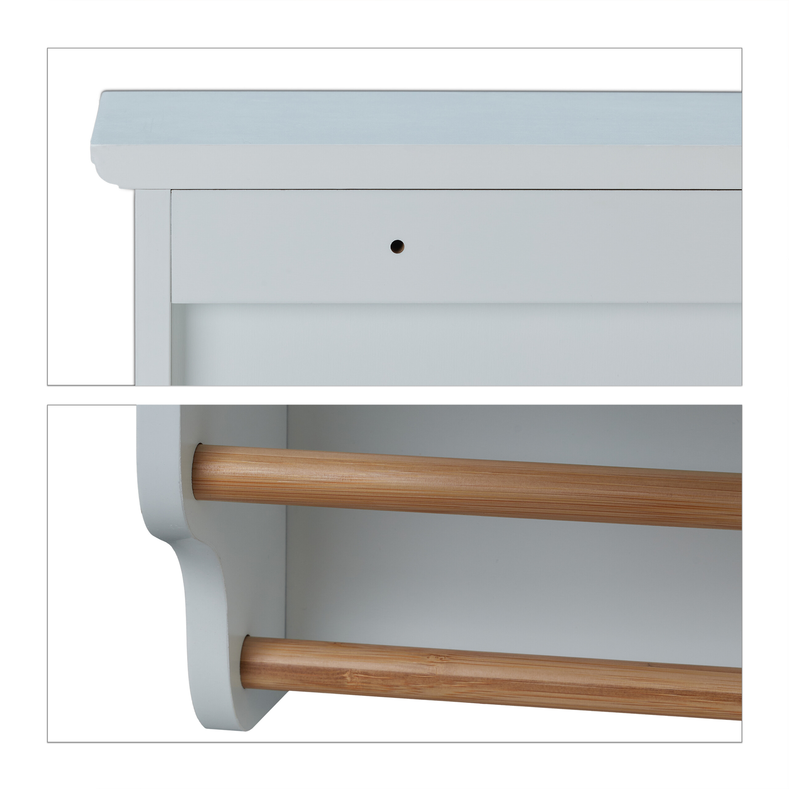 Rankšluosčių laikiklis: Strypai, pritvirtinti prie spintelės dugno, suteikia vietą taupančią rankšluosčių kabyklą.