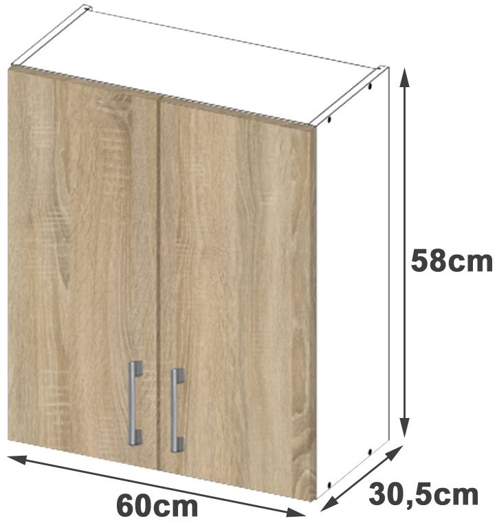 Sonoma ąžuolas – tai spalva, kuri vis dar labai populiari tarp žmonių, kurie baldus renkasi pagal savo keturis kampus. Ypač dažnai naudojamas svetainėse ir virtuvėse, jis puikiai dera su, be kita ko, su klasikiniu gražiu baltu. Derinant šias spalvas, buvo sukurtas universalus baldas, kuris gali būti naudojamas bet kurioje virtuvėje. Praktiška pakabinama spintelė W60 D2 yra vienas iš Lima kolekcijos pasiūlymų. Baldai, kurių viduje yra dvi talpios lentynos, pagaminti iš trinčiai atsparios laminuotos plokštės. Virtuvės įrangos elementas puikiai dera su likusia Lima kolekcijos dalimi. Savo klientams garantuojame aukštos kokybės baldus, pasižyminčius ilgaamžiškumu, o taip pat labai patraukliomis kainomis. Korpuso spalva – Balta Priekinės dalies spalva – Sonoma ąžuolas – Durelių viduje yra viena lentyna – Spintelė iš laminuotos plokštės, atsparios dilimui