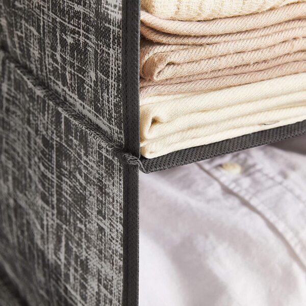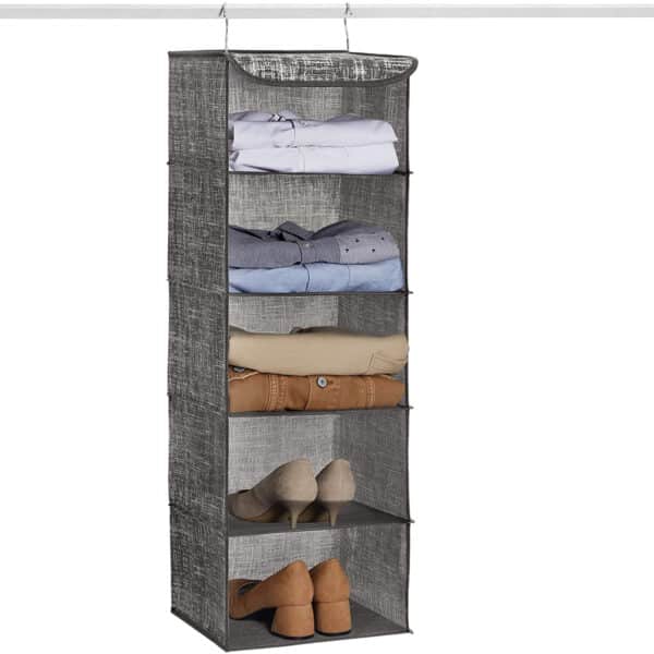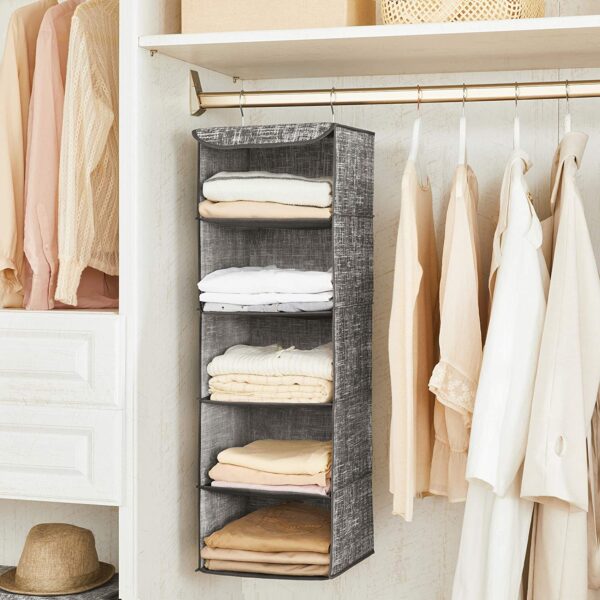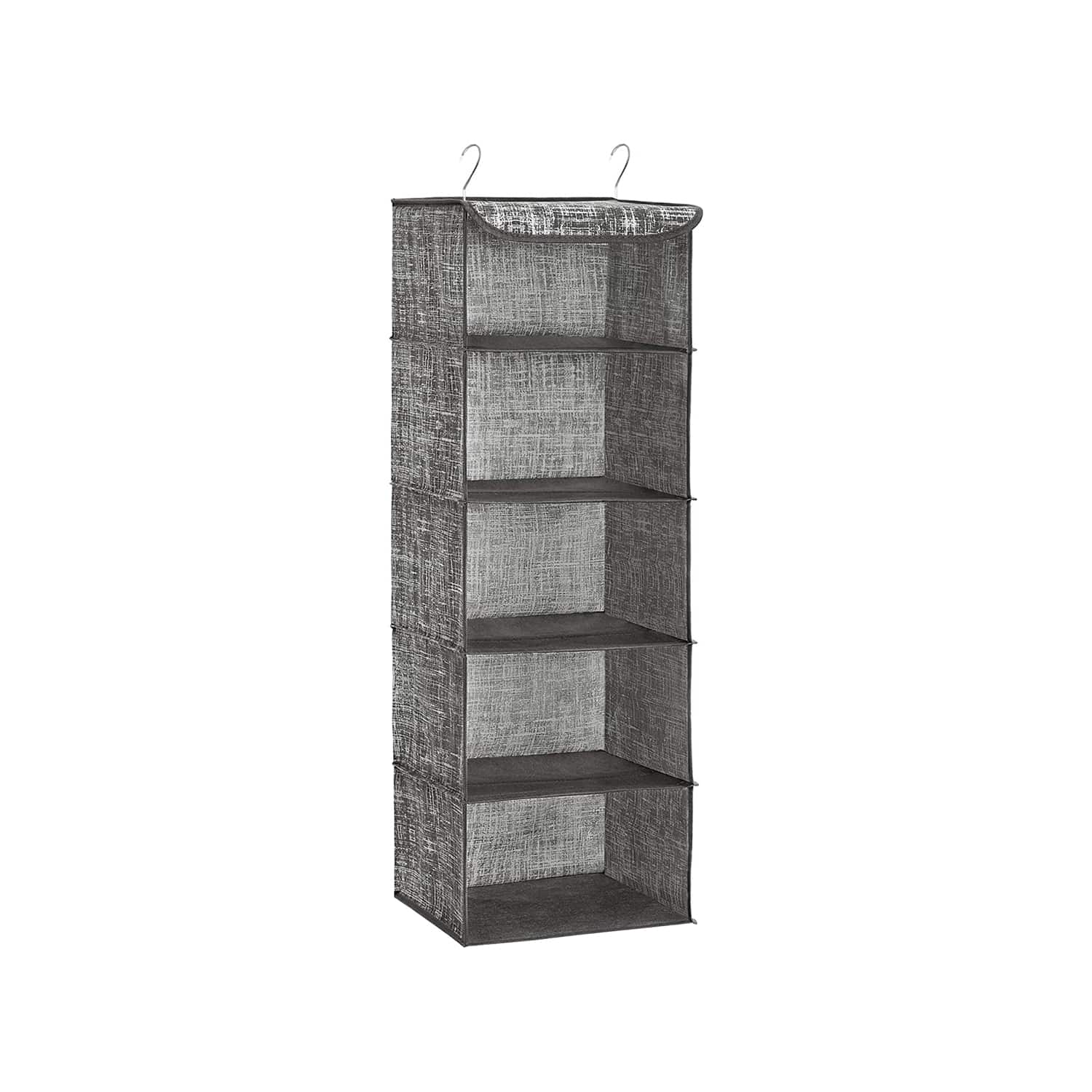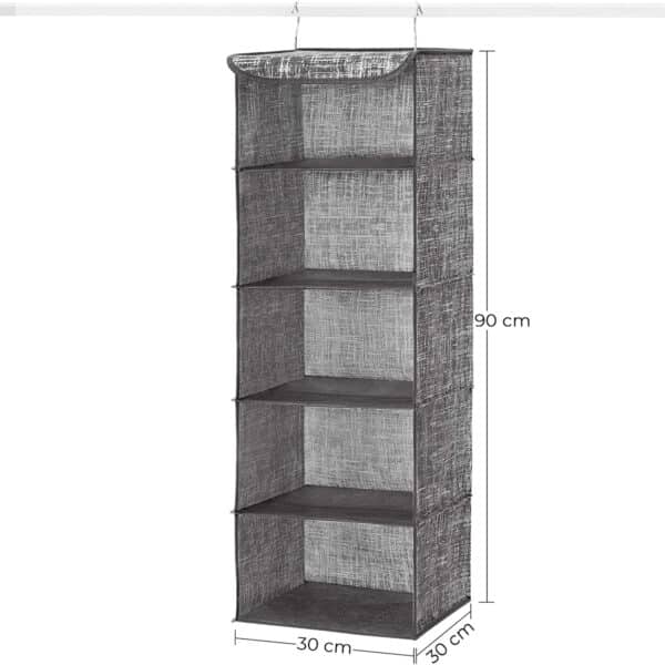 Ar jau apvertei visą savo spintą, kad rastum suknelę? Naudodami šią pakabinamą lentyną galite patobulinti savo drabužių spintą ir sutaupyti vargo krautis. Megztiniai, sijonai, suknelės, džinsai, rankinės, žaislai, batai, aksesuarai ir kt. – viskas puikiai telpa šiuose 5 skyriuose. Absoliutus hitas. Aiškiai sudėkite drabužius ir įdėkite šį dėklą, kad optimaliai išnaudotumėte vertikalią erdvę. Dėl įsiūtų bambukinių įdėklų jums nereikės jaudintis, kad lentynos nukarus. Be to, lininę tekstūrą primenantis neaustinis audinys ir pilkas atspalvis užtikrina šilumą ir ramybę jūsų spintoje, namelyje ar namelyje.