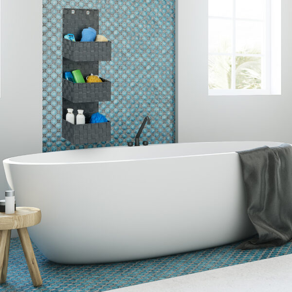 - Trijų skyrių dizainas: Idealiai tinka vonios reikmenims, kosmetikai ar rankinėms laikyti.