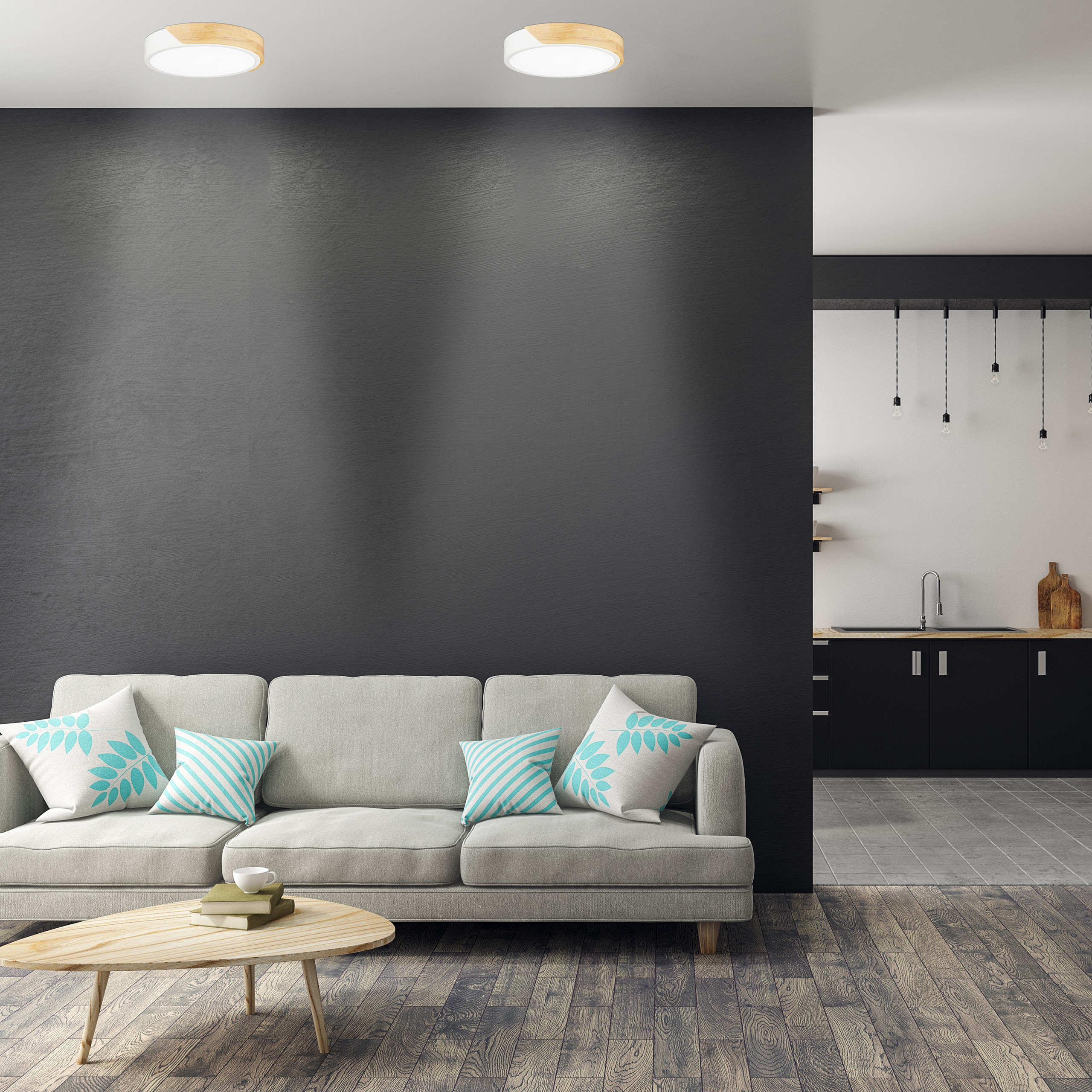 Spalvų derinys: Šviesiai ruda, juoda ir balta – šios spalvos puikiai dera tarpusavyje, suteikdamos šviestuvui modernų ir elegantišką išvaizdą.